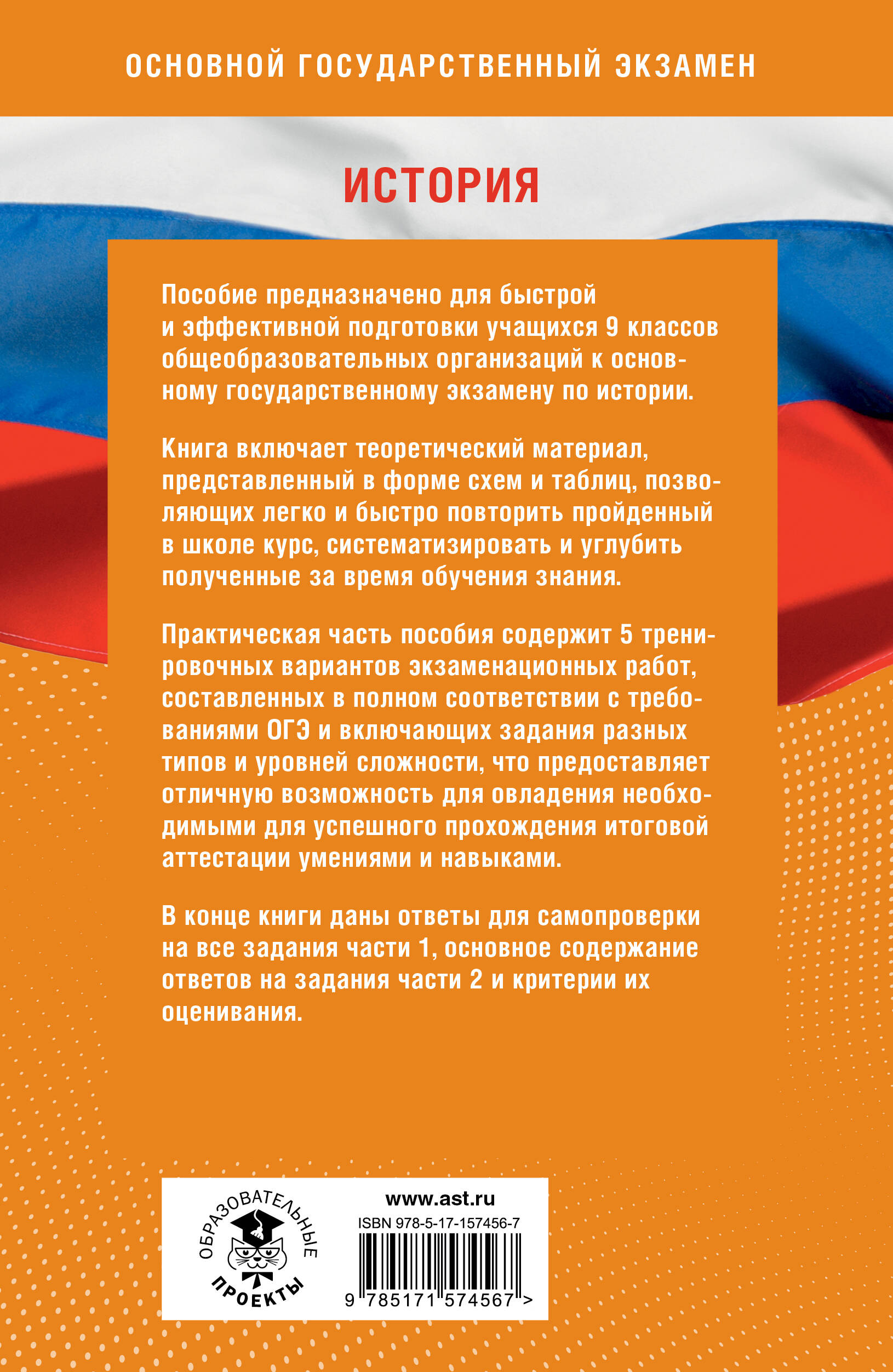 Пособие предназначено для быстрой и эффективной подготовки учащихся 9 классов общеобразовательных организаций к основному государственному экзамену по истории. Книга включает теоретический материал, представленный в форме схем и таблиц, позволяющих легко и быстро повторить пройденный в школе курс, систематизировать и углубить полученные за время обучения знания. Практическая часть пособия содержит 5 тренировочных вариантов экзаменационных работ, составленных в полном соответствии с требованиями ОГЭ и включающих задания разных типов и уровней сложности, что предоставляет отличную возможность для овладения необходимыми для успешного прохождения итоговой аттестации умениями и навыками. В конце книги даны ответы для самопроверки на все задания части 1, основное содержание ответов на задания части 2 и критерии их оценивания.| Издательство | ИЗДАТЕЛЬСТВО "АСТ" |