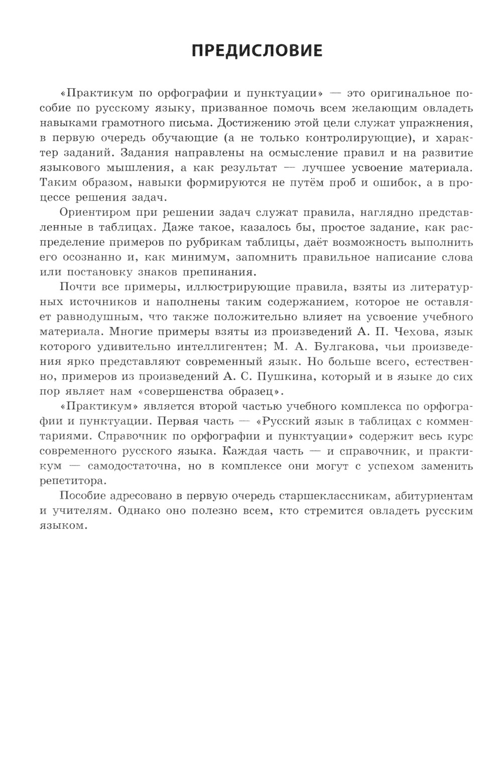 «Практикум по орфографии и пунктуации» - оригинальное пособие по русскому языку, призванное помочь всем желающим овладеть навыками грамотного письма. «Практикум» является второй частью учебного комплекса по орфографии и пунктуации, т. е. продолжением Справочника «Русский язык в таблицах». Каждая часть самодостаточна, но в комплексе они могут с успехом заменить репетитора. «Практикум» содержит упражнения, в первую очередь обучающие, а не только контролирующие. Таким образом, навыки овладения грамотным письмом формируются не путём проб и ошибок, а в процессе решения задач. Ориентиром при решении задач служат правила, наглядно представленные в таблицах, ссылки на которые есть в «Практикуме». Почти все примеры, иллюстрирующие правила, взяты из литературных источников. Пособие адресовано в первую очередь старшеклассникам, абитуриентам и учителям, однако оно полезно всем, кто стремится овладеть русским языком.| Издательство | Айрис-Пресс |
