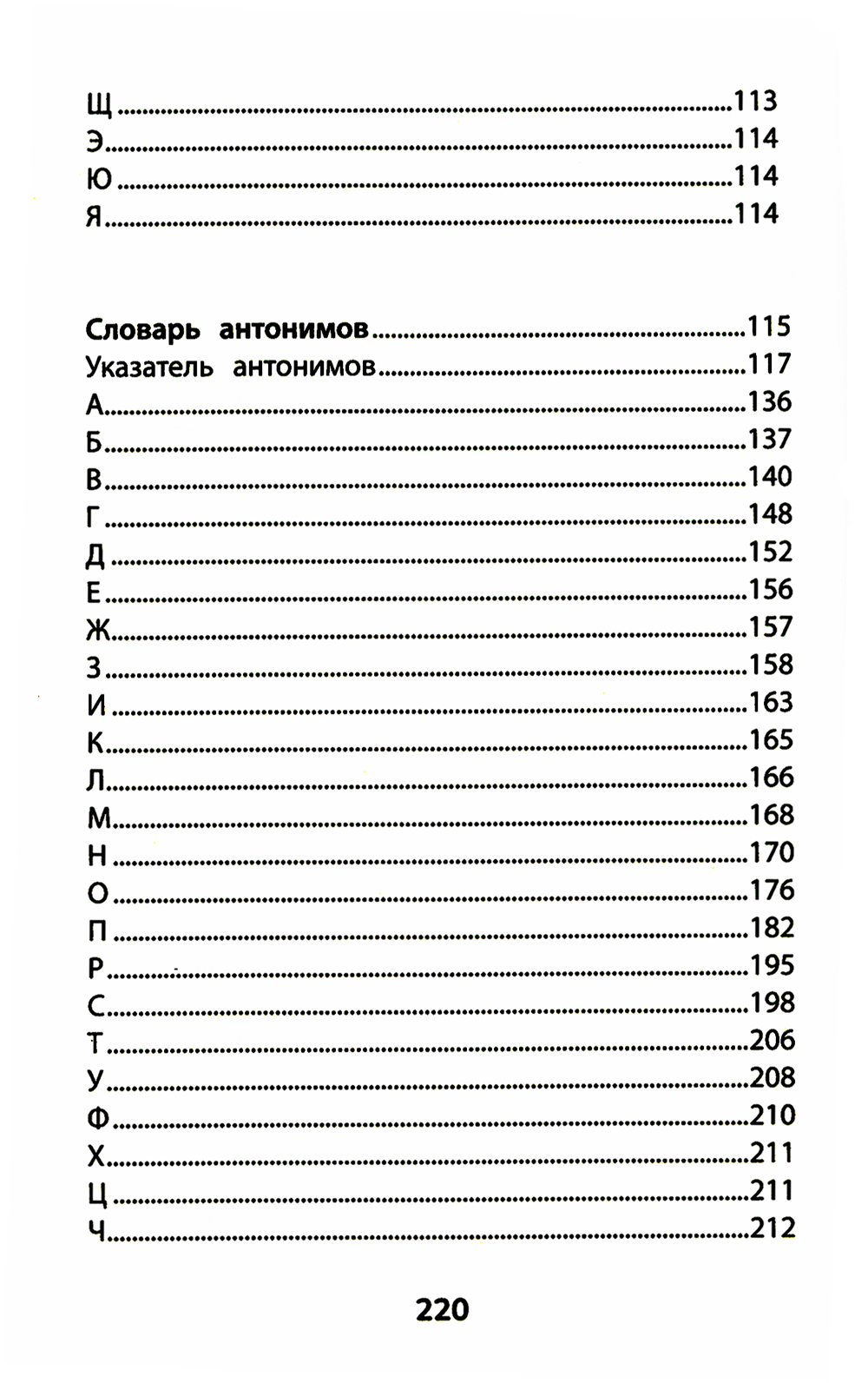 Словарь антонимов включает около 1 500 антонимических пар и состоит из основного раздела, в котором представлены слова-антонимы знаменательных частей речи, и словоуказателя антонимических пар.