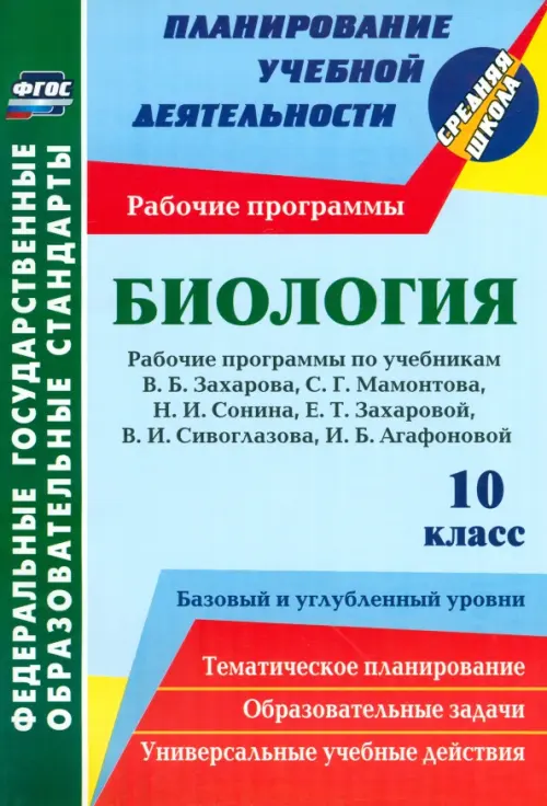 В пособии представлены рабочие программы по биологии для 10 класса (базовый и углубленный уровни), разработанные в соответствии с ФГОС СОО, планируемыми результатами образования по предмету и требованиями Примерной образовательной программы, ориентированные на работу по учебникам В.Б. Захарова, С.Г. Мамонтова, Н.И. Сонина, Е.Т. Захаровой, В.И. Сивоглазова, И.Б. Агафоновой (М.: Дрофа, 2014).