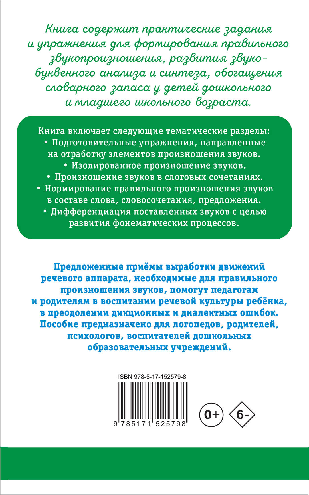 Книга содержит практические задания и упражнения для формирования правильного звукопроизношения, развития звуко-буквенного анализа и синтеза, обогащения словарного запаса у детей дошкольного и младшего школьного возраста. Книга включает тематические разделы: • Подготовительные упражнения, направленные на отработку элементов произношения звуков. • Изолированное произношение звуков. • Произношение звуков в слоговых сочетаниях. • Нормирование правильного произношения звуков в составе слова, словосочетания, предложения. • Дифференциация поставленных звуков с целью развития фонематических процессов. Предложенные приемы выработки движений речевого аппарата, необходимые для правильного произношения звуков, помогут педагогам и родителям в воспитании речевой культуры ребёнка, в преодолении дикционных и диалектных ошибок. Пособие предназначено для логопедов, родителей, психологов, воспитателей дошкольных образовательных учреждений.