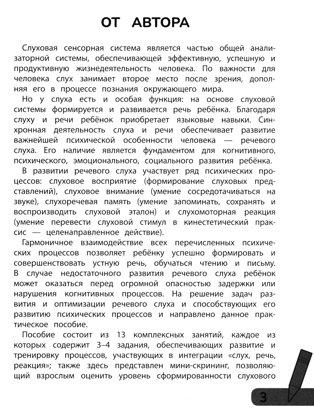 «Комплексные игры: слух, речь, реакция» - это практическое пособие для проведения развивающей работы с детьми 5-6 лет (без нарушения слуха). Целью занятий является активизация речевого слуха, слухового восприятия, внимания, слуховой памяти, а также синхронизации деятельности между слухоречевыми и моторными процессами (вербальными и невербальными) ребёнка. Благодаря комплексным играм ребёнок сможет легче усваивать информацию на слух, ориентироваться на слуховую инструкцию и соотносить свои действия в пространственно-координационной и речевой деятельности. В пособии представлены 13 занятий, каждое из которых содержит 3-4 игры-задания для тренировки взаимодействия между слухом, речью и реакцией. Занятия будут полезны как для детей с нормотипическим развитием, так и для детей с ОНР III-IV уровня. Пособие рекомендовано для педагогов дошкольных учреждений и родителей для домашних занятий с ребёнком.| Издательство | Феникс |