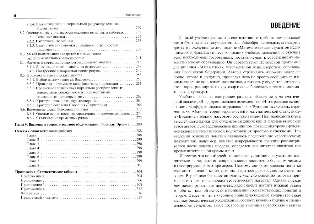 Учебник соответствует учебной программе по дисциплине «Математика» фармацевтических и медицинских высших учебных заведений, составленной на основании Федерального государственного образовательного стандарта высшего профессионального образования третьего поколения. В учебнике изложен курс математики, включающий основные элементарные функции, дифференциальное исчисление функции одной переменной, элементы дифференциального исчисления функции нескольких переменных, интегральное исчисление функции одной переменной, дифференциальные уравнения первого и второго порядков, основы теории вероятностей и математической статистики. Учебник содержит подробные пояснения теоретического материала и большое количество разобранных примеров и задач. Предназначен студентам и аспирантам медицинских и фармацевтических вузов, врачам, провизорам и лицам, самостоятельно изучающим математику и математическую статистику.
