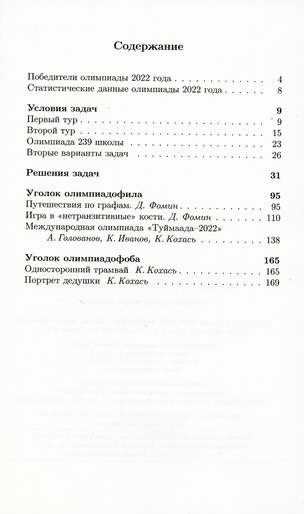 Книга предназначена для школьников, учителей, преподавателей математических кружков и просто любителей математики. Читатель найдет в ней задачи Санкт-Петербургской олимпиады школьников по математике 2022 года, а также задачи открытой олимпиады ФМЛ № 239, которая, не будучи туром Санкт-Петербургской олимпиады, по характеру задач, составу участников и месту проведения является прекрасным дополнением к ней.