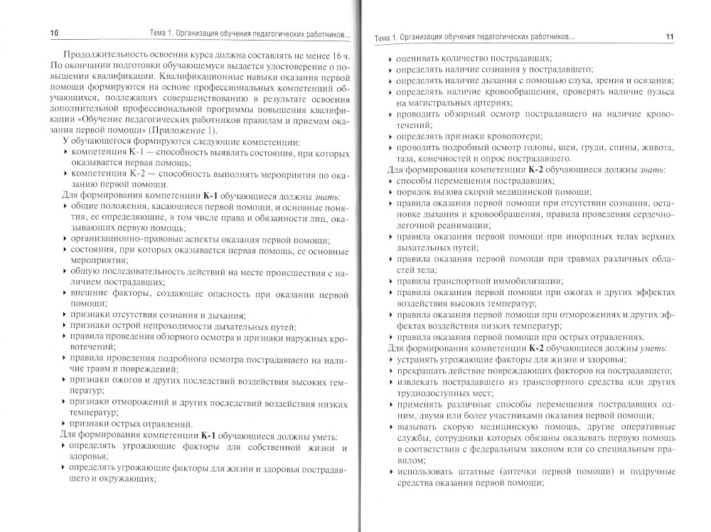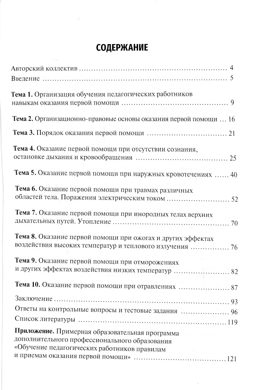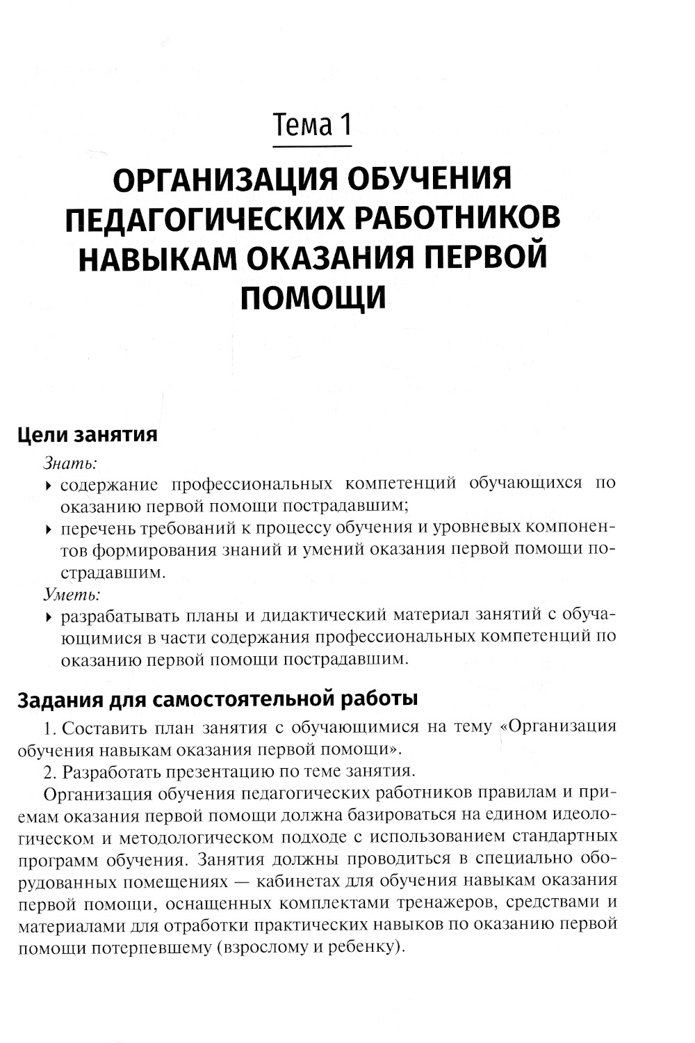 Обучение педагогических работников правилам и навыкам оказания первой помощи является обязательным требованием для получения организацией лицензии на образовательную деятельность. В учебном пособии рассмотрены вопросы оказания своевременной помощи людям, пострадавшим в результате чрезвычайных происшествий, особенно если речь идет об обучающихся (детях, подростках, молодежи). Издание содержит иллюстративный материал, тестовые и ситуационные задачи и учебную программу, рассчитанную на 16 учебных часов. Пособие предназначено преподавателям, обучающим педагогических работников правилам и приемам оказания первой помощи учащимся образовательных организаций всех уровней. Может быть использовано в качестве дополнительной литературы педагогами, проходящими курс обучения правилам и приемам оказания первой помощи.