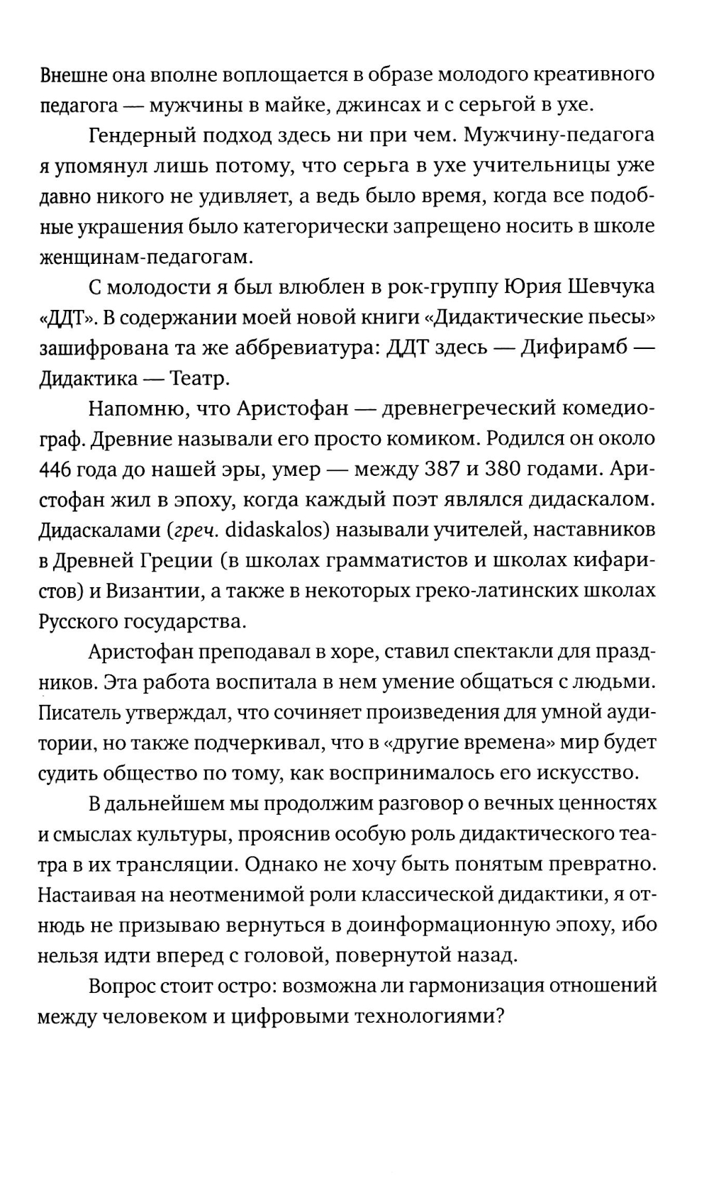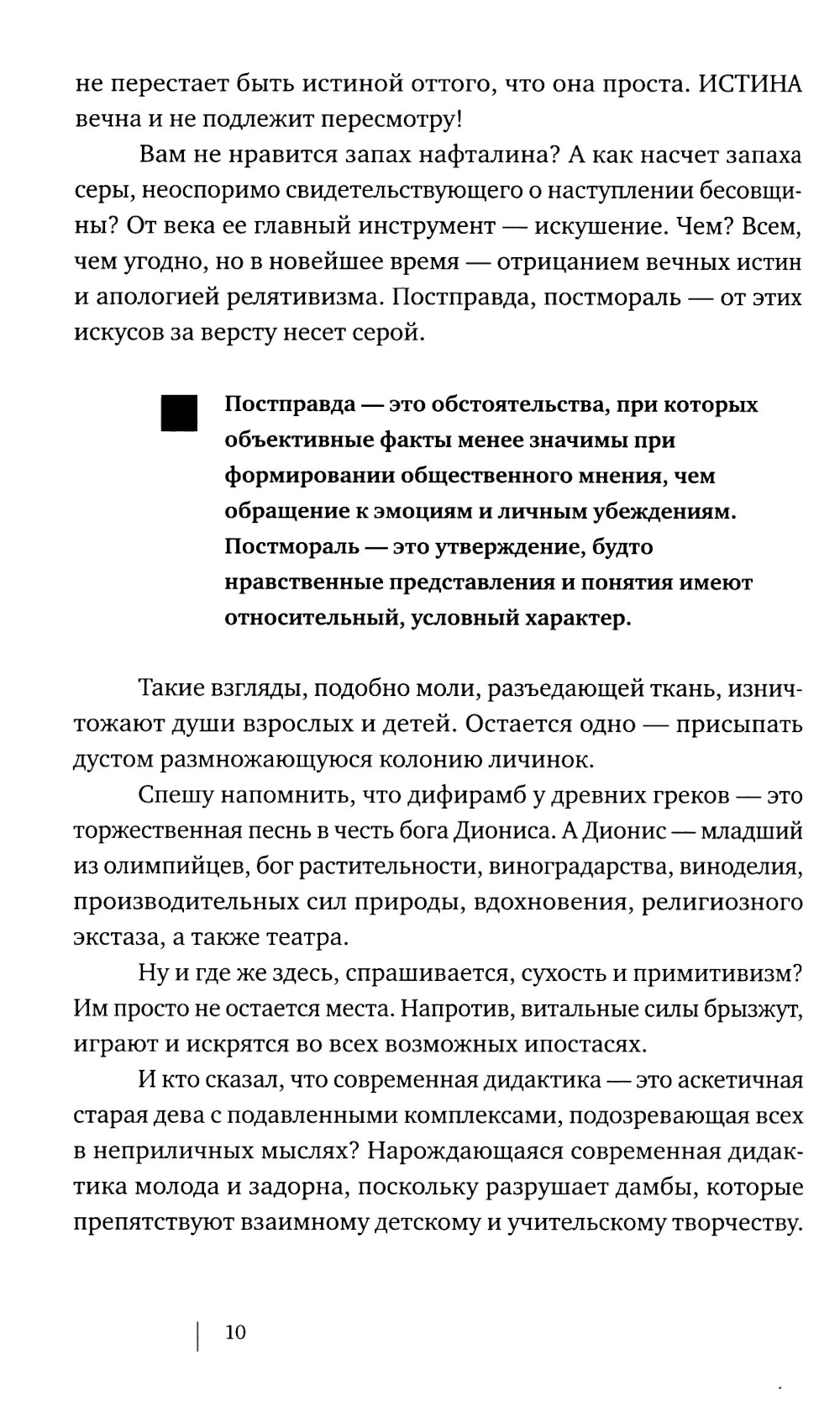 Евгений Ямбург, известный российский педагог и общественный деятель, доктор педагогических наук, академик, в новой книге обобщает опыт и делится своей методикой использования театра в воспитании. Играя в школьных спектаклях, дети пропускают через себя ощущения своих персонажей и таким образом приобретают жизненный опыт: психологический, эмоциональный. По сути, это есть опыт исторический, пробуждающий в человеке память поколений. В концепции «Homo ludens. Человек играющий» знаменитый нидерландский культуролог Йохан Хёйзинга убедительно доказал, что в основе человеческой культуры лежит игра. «Весь мир - театр... Все люди в нем - актеры...» Закономерно, что для передачи культурного кода воспитатель использует игру. Ему необходимо это умение, ибо игра рождает эмоции, а без эмоций не пробудить душу. Эта книга - практическое осмысление культурных теорий, а также методическая помощь каждому, кто пожелает проверить их и воплотить в жизнь.| Издательство | Бослен |