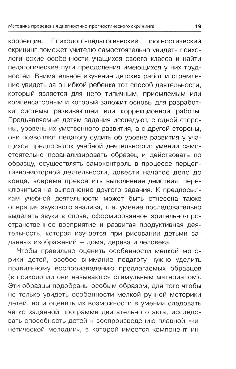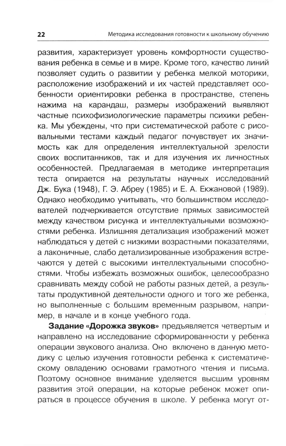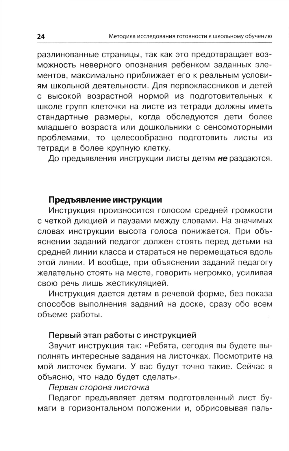 Учителям начальной школы очень важно правильно оценить, с каким уровнем подготовки приходят в школу первоклассники. Воспитателям подготовительных групп тоже важно определить уровень готовности детей к школе. И тем, и другим поможет простая и надежная методика исследования психофизиологической готовности детей 6-7 лет к школьному обучению. Обследование проводится в начале учебного года: рекомендуются вторая и третья неделя сентября. В результате у педагога появляется возможность уже на начальном этапе обучения увидеть особенности каждого конкретного ребенка и в связи с выявленными проблемами слегка перестроить подходы к обучению и воспитанию. А результаты исследования в конце учебного года позволят оценить динамику развития ребенка. Для исследования используется набор из четырех заданий: «Графические ряды», «Точки», «Рисунок «Дом. Дерево. Человек» и «Дорожка звуков». Этот набор позволяет педагогу получить достаточно полные представления о развитии у ребенка предпосылок к учебной деятельности, об уровне развития его интеллекта, о его обучаемости, визуальных представлениях об окружающем мире, о работоспособности, утомляемости и других психофизиологических составляющих психической деятельности. Многочисленные примеры анализа работ дошкольников и первоклассников помогут учителям и воспитателям объективно интерпретировать полученные результаты. Пособие адресовано учителям первых классов, воспитателям детских садов, школьным психологам и методистам.| Издательство | Каро |
