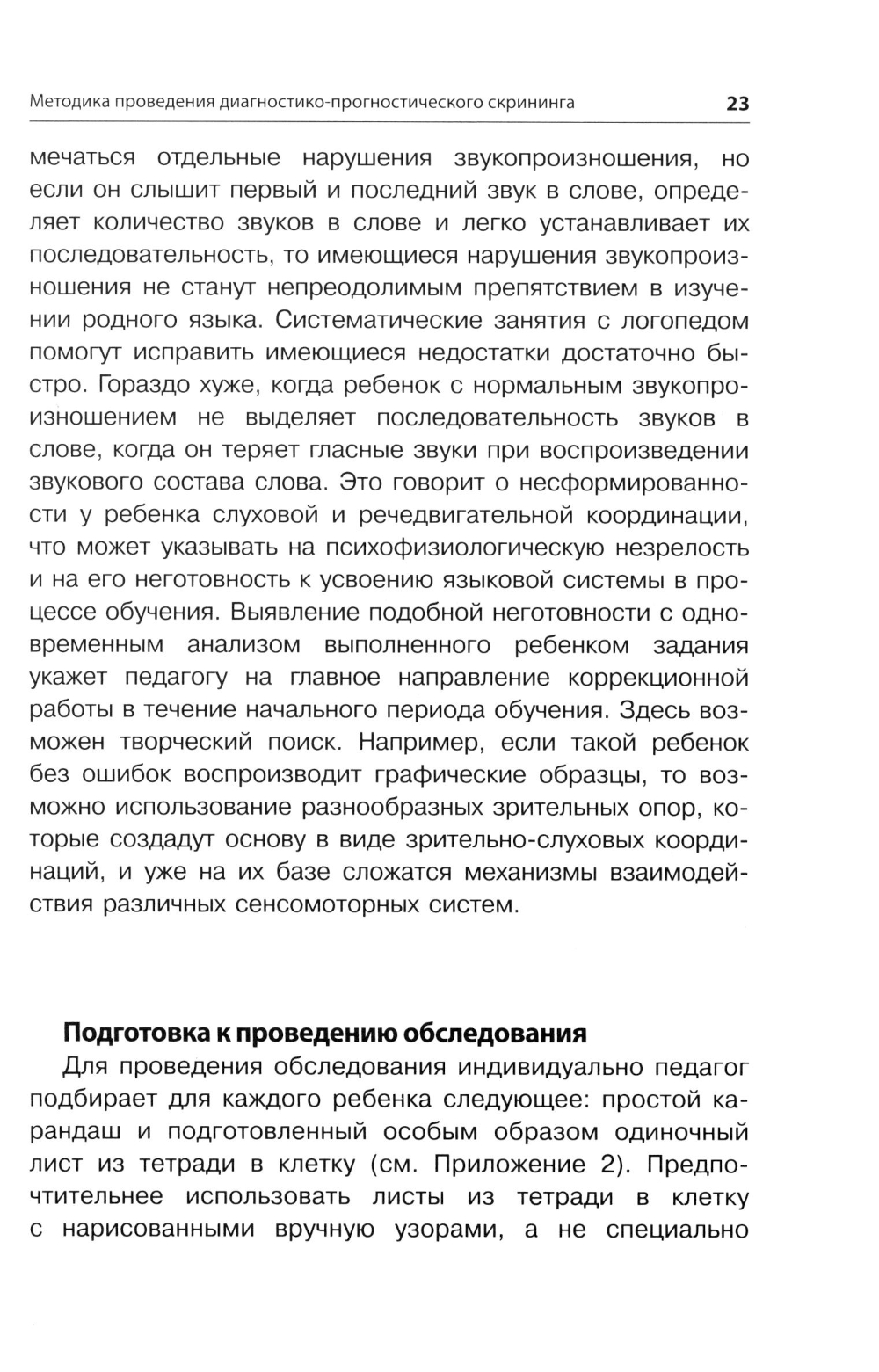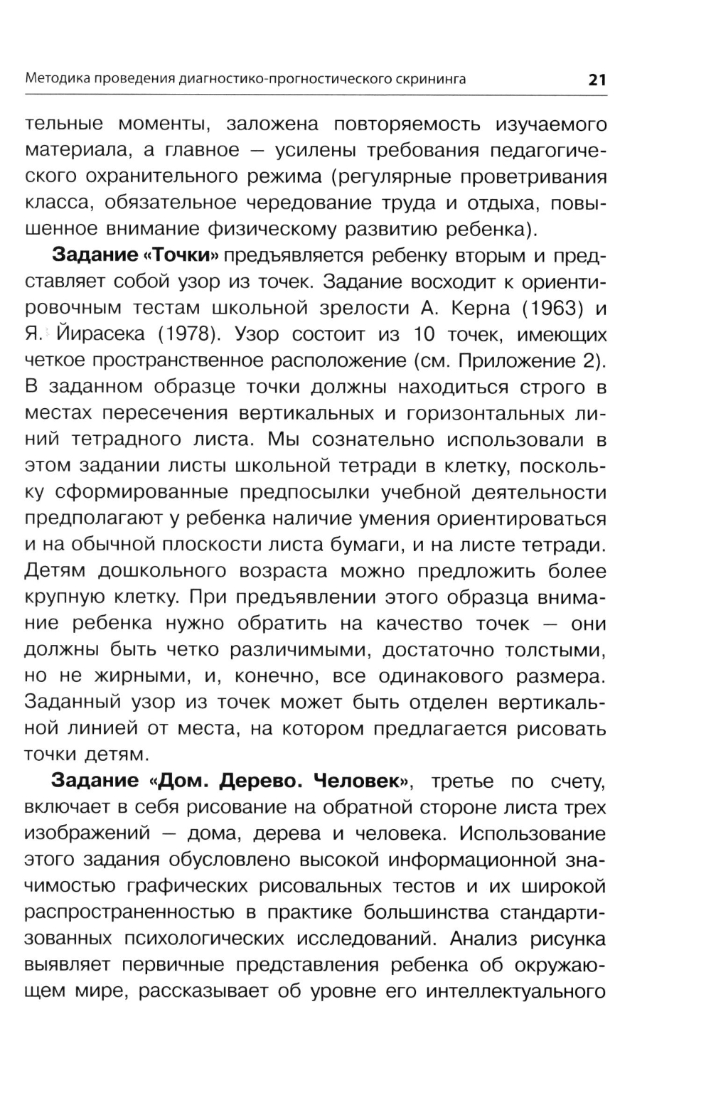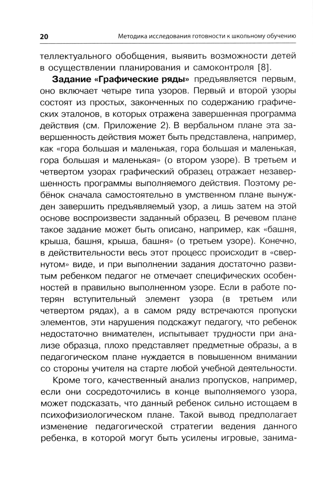 Учителям начальной школы очень важно правильно оценить, с каким уровнем подготовки приходят в школу первоклассники. Воспитателям подготовительных групп тоже важно определить уровень готовности детей к школе. И тем, и другим поможет простая и надежная методика исследования психофизиологической готовности детей 6-7 лет к школьному обучению. Обследование проводится в начале учебного года: рекомендуются вторая и третья неделя сентября. В результате у педагога появляется возможность уже на начальном этапе обучения увидеть особенности каждого конкретного ребенка и в связи с выявленными проблемами слегка перестроить подходы к обучению и воспитанию. А результаты исследования в конце учебного года позволят оценить динамику развития ребенка. Для исследования используется набор из четырех заданий: «Графические ряды», «Точки», «Рисунок «Дом. Дерево. Человек» и «Дорожка звуков». Этот набор позволяет педагогу получить достаточно полные представления о развитии у ребенка предпосылок к учебной деятельности, об уровне развития его интеллекта, о его обучаемости, визуальных представлениях об окружающем мире, о работоспособности, утомляемости и других психофизиологических составляющих психической деятельности. Многочисленные примеры анализа работ дошкольников и первоклассников помогут учителям и воспитателям объективно интерпретировать полученные результаты. Пособие адресовано учителям первых классов, воспитателям детских садов, школьным психологам и методистам.| Издательство | Каро |