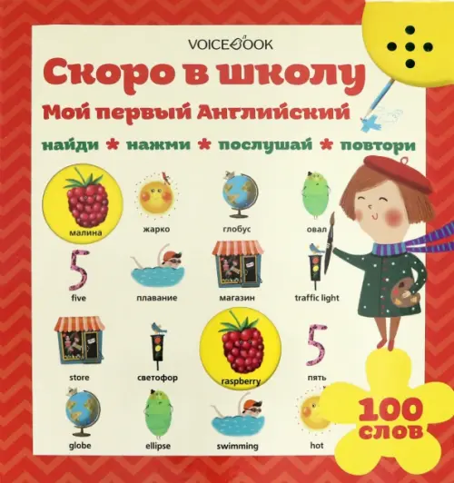Интерактивная голосовая книга для изучения английского языка "Скоро в школу". 100 новых английских слов в новой книге! Это вторая часть серии "Мой первый английский", при помощи которой играючи можно выучить много нового, научиться считать, узнать, как называются клубника, малина, арбуз и другие ягоды на английском языке, а также различные слова из тем "спорта" и "школы". Ребенку нужно найти одинаковые изображения: одно из изображений озвучено на русском языке, другое - на английском. Нажимая на рисунок и повторяя услышанное, ребенок понимает, что один и тот же предмет звучит по-разному и запоминает, как его произносить.