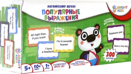 "Английский? Легко! Популярные выражения" - набор образовательных карточек, которые помогут ребёнку выучить самые важные английские фразы. С одной стороны карточек ждёт русское выражения, а с обратной стороны - не только его английский перевод, но и транскрипция на русском языке. Это значительно облегчит изучение незнакомых выражений. Показывайте карточку ребёнку сначала одной стороной, а затем проверяйте вместе ответ, перевернув карточку другой стороной.