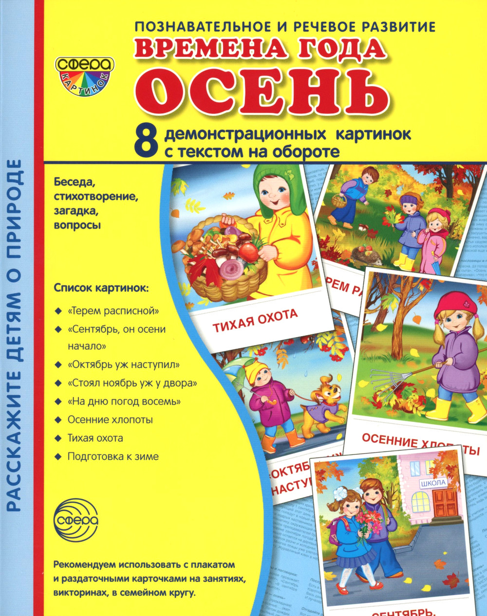 Комплект состоит из демонстрационных картинок размером 174х220 мм и раздаточных карточек размером 63х87 мм, предназначен для работы с дошкольниками и младшими школьниками на индивидуальных и групповых занятиях. На лицевой стороне каждой картинки дается цветное изображение с указанием темы, на обратной - краткое описание.