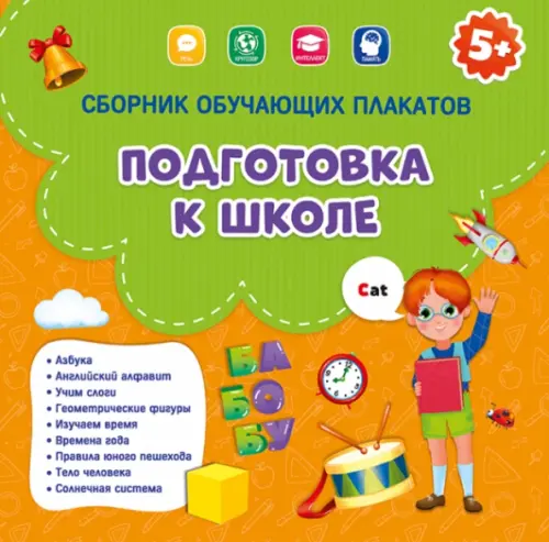 Сборник состоит из 9 обучающих плакатов, направленных на изучение букв и слогов русского языка, букв английского языка, геометрических фигур. С помощью плакатов ребёнок научится ориентироваться во времени, различать времена года и природные явления, узнает о правилах юного пешехода, познакомится со строением тела человека, получит знания об устройстве солнечной системы.