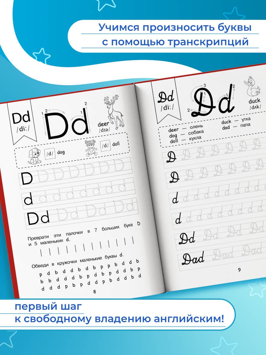 Пособие поможет детям не только освоить правильное написание печатных и письменных английских букв, но и запомнить их и уверенно различать при любом написании. Выполняя разнообразные упражнения, они не только будут красиво писать, но и запомнят 180 английских слов и получат первые уроки правильного произношения. Дети знакомятся с буквами в алфавитном порядке, а в заданиях на прописывание слов используются только те буквы, которые они уже запомнили и написали! Чтобы свободно общаться на английском языке, нужно сделать первый шаг - научиться писать и читать. Сделайте его!| Издательство | ООО "Издательство "Эксмо" |