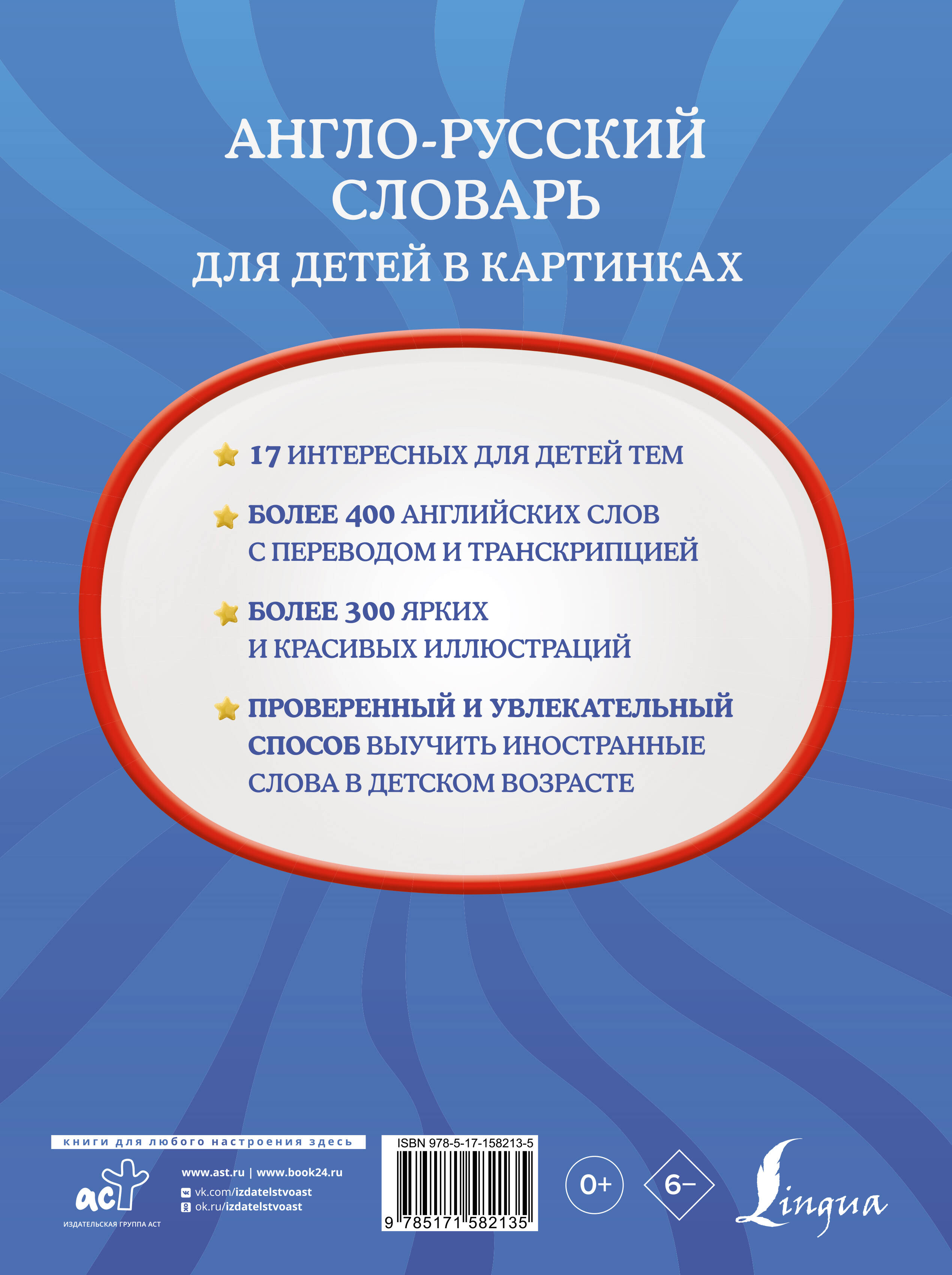 Книга представляет собой детский тематический словарь, в котором более 400 английских слов, разделенных на 17 интересных для детей тем и сопровождающихся яркими и красивыми иллюстрациями, а также переводом и двумя видами транскрипции - фонетической и русскими буквами. Словарь в картинках - проверенный и увлекательный способ выучить первые иностранные слова в детстве. Издание предназначается для детей старшего дошкольного возраста, а также для родителей и учителей.| Издательство | Издательство "АСТ" |