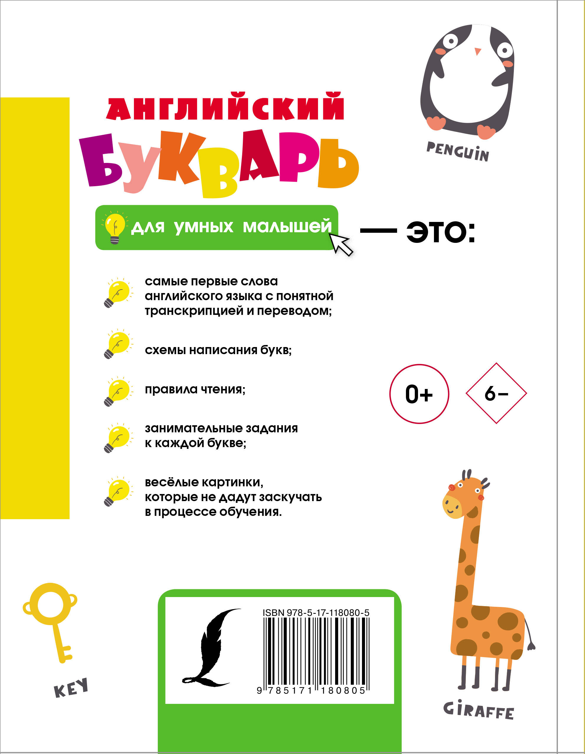 Эта красочная книга с чудесными иллюстрациями поможет вашему ребенку сделать первые шаги в изучении букв английского алфавита. Несложные слова с русской транскрипцией и переводом, схемы написания букв и правила чтения звуков, занимательные головоломки сделают процесс обучения приятным и простым. Этот букварь для умных малышей с развивающими заданиями может использоваться как в детских учебных заведениях, так и для самостоятельных занятий с детьми в домашней обстановке.| Издательство | ИЗДАТЕЛЬСТВО "АСТ" |