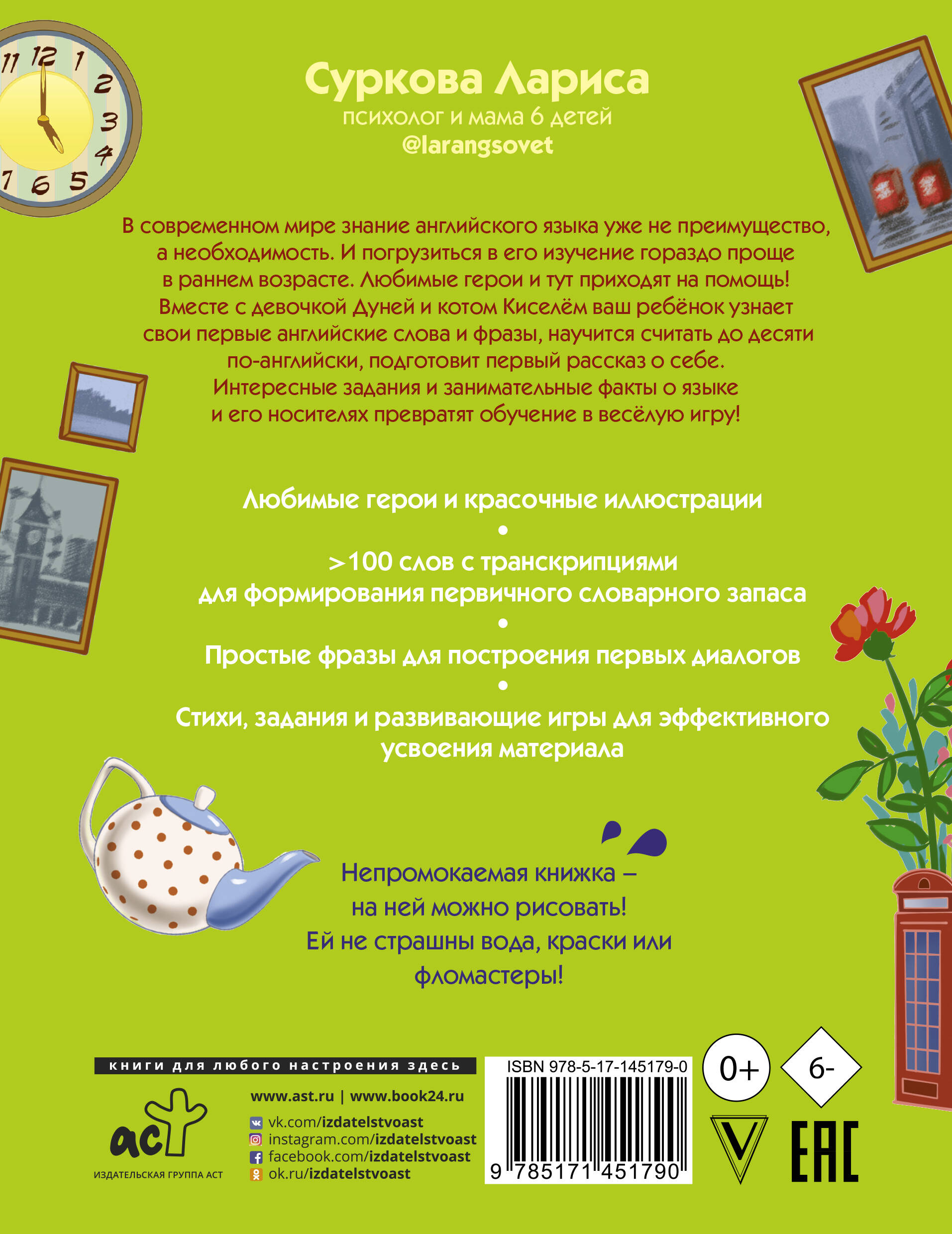 В современном мире знание английского языка уже не преимущество, а необходимость. И погрузиться в его изучение гораздо проще в раннем возрасте. Любимые герои и тут приходят на помощь! Вместе с девочкой Дуней и котом Киселём ваш ребёнок узнает свои первые английские слова и фразы, научится считать до десяти по-английски, подготовит первый рассказ о себе. Интересные задания и занимательные факты о языке и его носителях превратят обучение в весёлую игру. На страницах книги вы найдёте: >100 слов с транскрипциями для формирования первичного словарного запаса Простые фразы для построения первых диалогов Стихи, задания и развивающие игры для эффективного усвоения материала| Издательство | Издательство "АСТ" |
