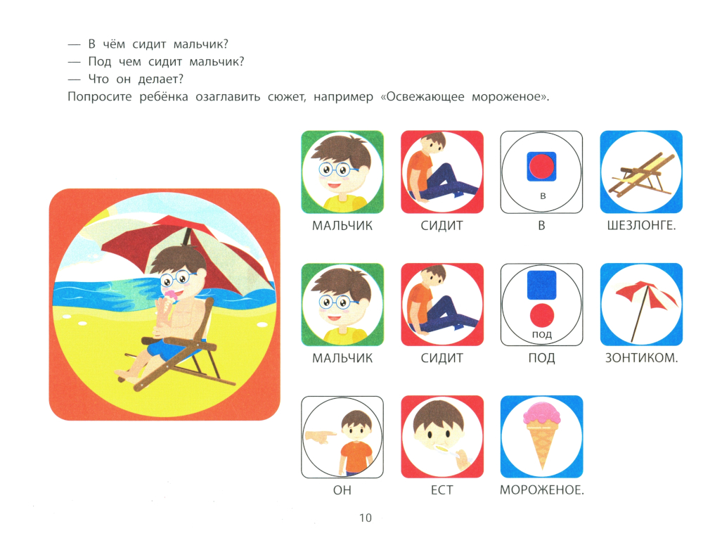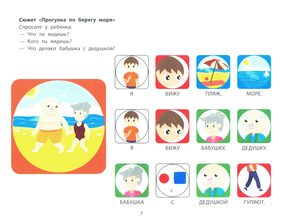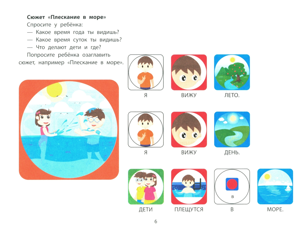 Это издание поможет ребёнку конструировать предложения и составлять рассказы по сюжетным картинкам из данного альбома. Материал разработан для детей разного уровня языкового развития, в том числе и для тех, у которых есть сложности со спонтанной речью. К каждому сюжету прилагаются фразы для чтения. Ребёнок с помощью наглядного моделирования предложения автоматизирует навык построения фраз, обогащая словарный запас и постигая азы чтения.