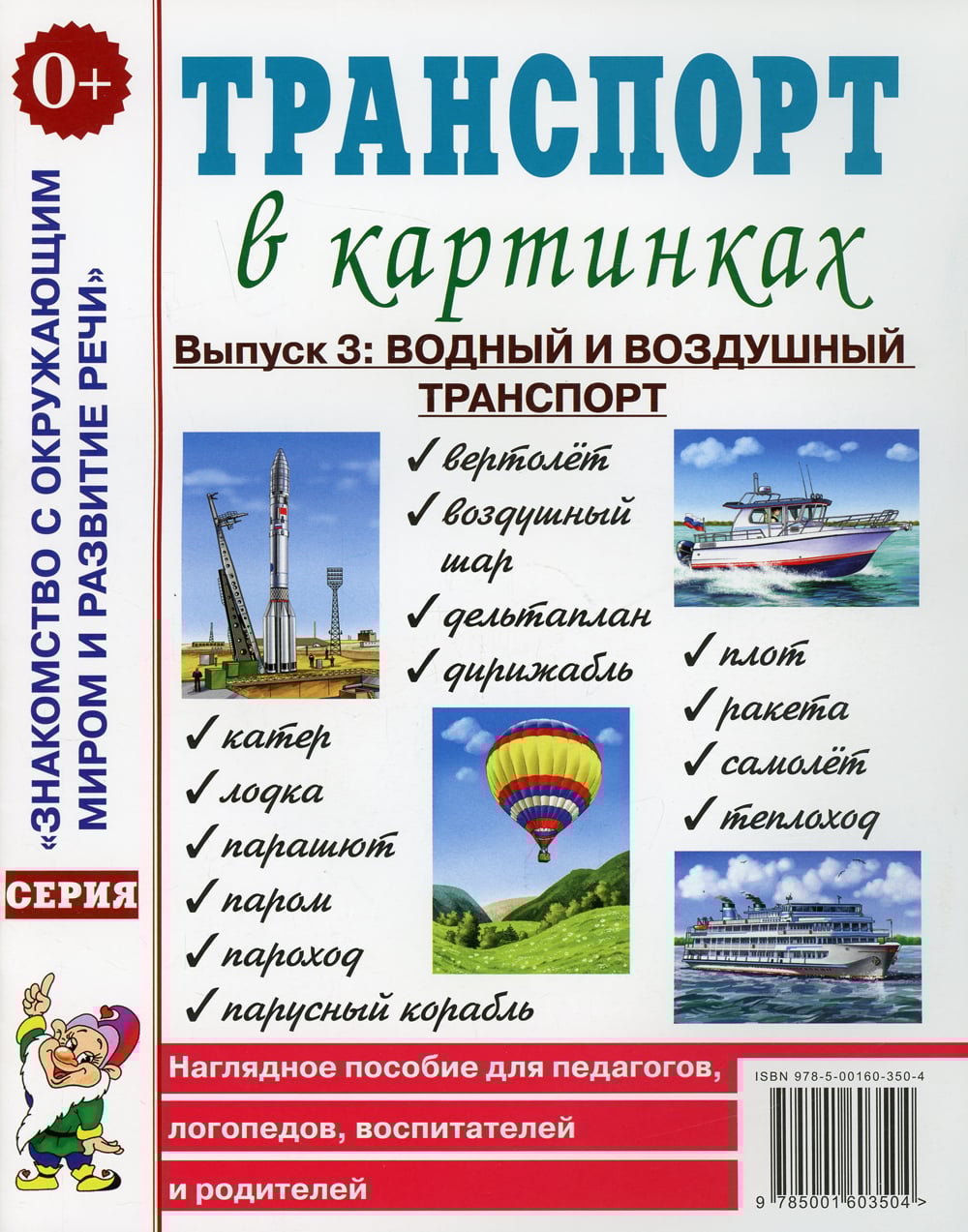 Транспорт в картинках. Выпуск 3. Водный и воздушный транспорт. Наглядное пособие для педагогов, логопедов, воспитателей и родителей. В выпуске представлены изображения: - вертолет - воздушный шар - дельтаплан - дирижабль - катер - лодка - парашют - паром - пароход - парусный корабль - плот - ракета - самолет - теплоход.| Издательство | Гном |