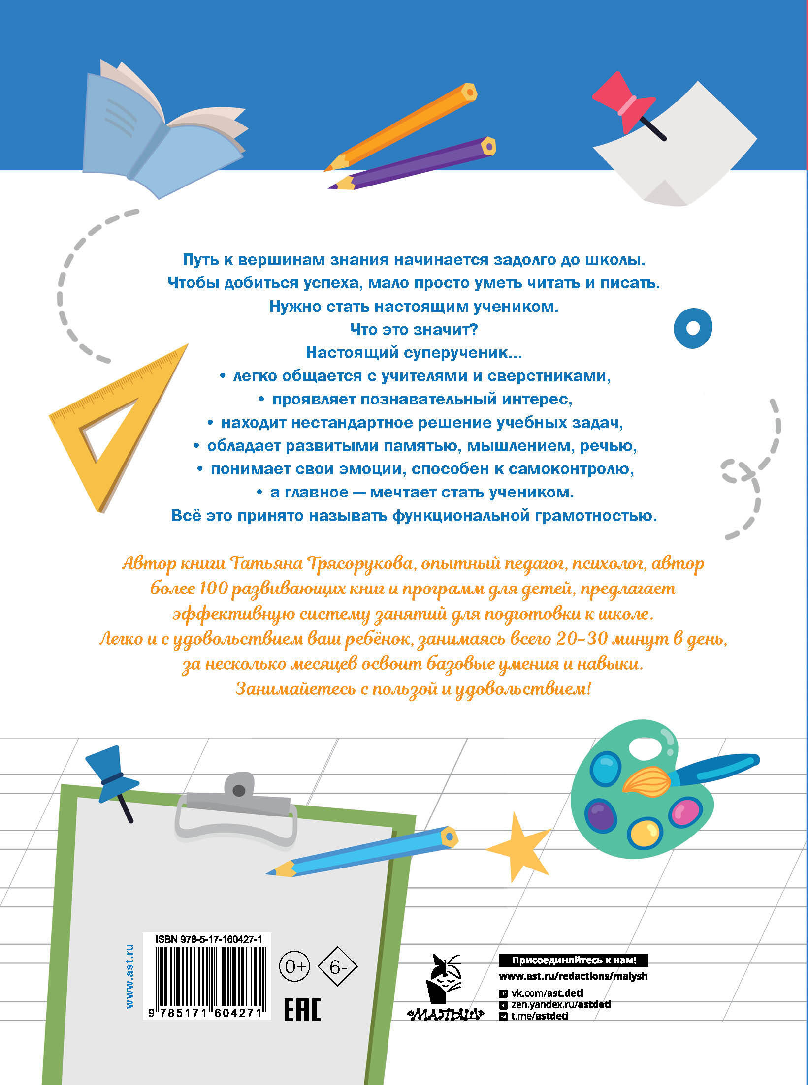 Что умеет настоящий суперученик? Легко общаться с учителями и сверстниками, нестандартно подходит к решению задач, обладает развитыми памятью, мышлением и речью. Все эти навыки принято называть функциональной грамотностью. Именно она помогает ребенку учиться в школе легко и с удовольствием! Автор книги Татьяна Трясорукова - опытный педагог и психолог - подготовила увлекательные тестовые задания, которые понравятся даже самому непоследливому малышу. Все задания сопровождаются подсказками для родителей и соответствуют Федеральному государственному образовательному стандарту дошкольного образования. Книга станет прекрасным подарком для будущих отличников.| Издательство | Издательство "АСТ" |