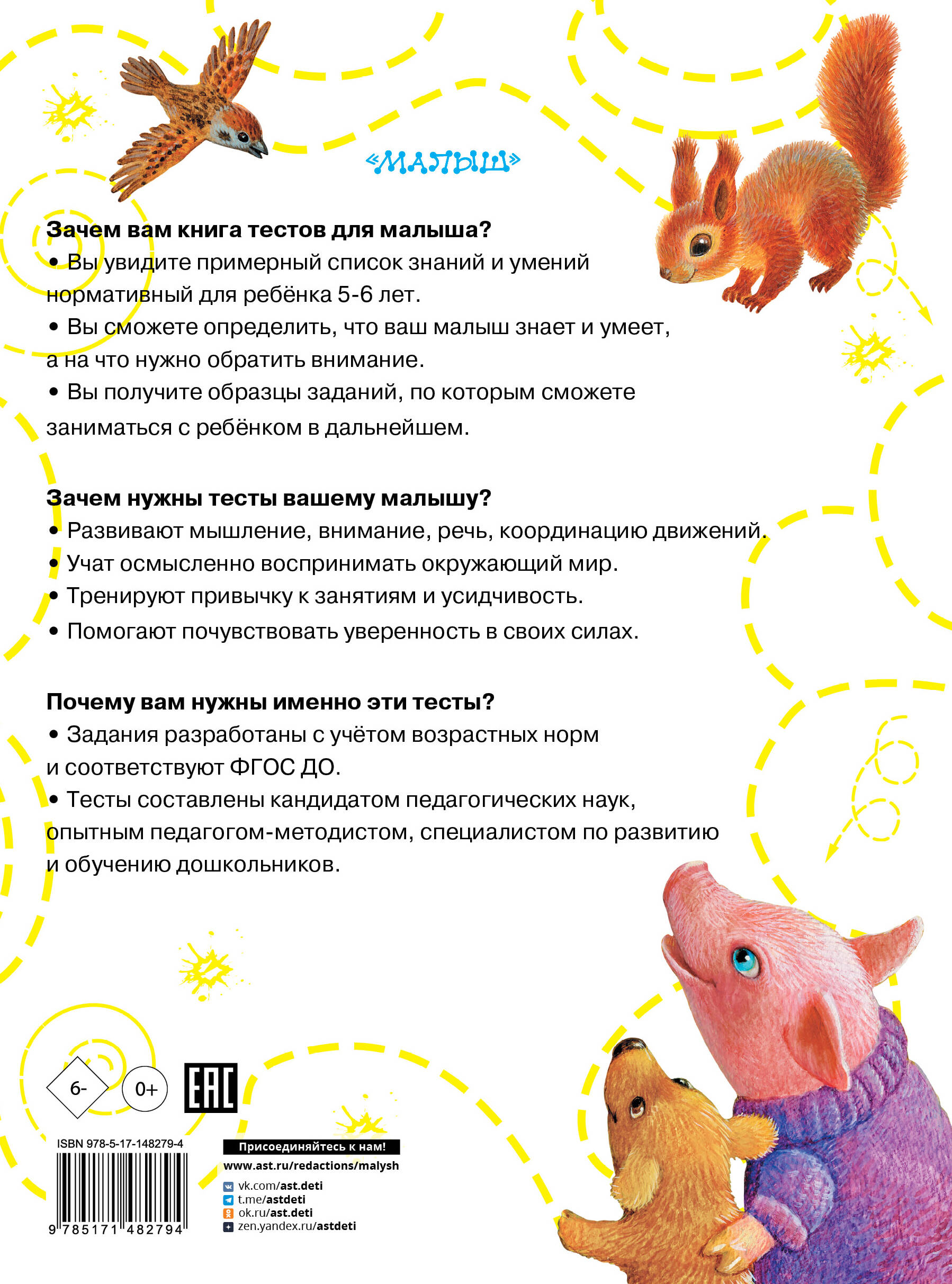 Зачем вам книга тестов для малыша? • Вы увидите примерный список знаний и умений нормативный для ребёнка 2-3 лет. • Вы сможете определить, что ваш малыш знает и умеет, а на что нужно обратить внимание. • Вы получите образцы заданий, по которым сможете заниматься с ребёнком в дальнейшем. Зачем нужны тесты вашему малышу? • Развивают мышление, внимание, речь, координацию движений. • Учат осмысленно воспринимать окружающий мир. • Тренируют привычку к занятиям и усидчивость. • Помогают почувствовать уверенность в своих силах. Почему вам нужны именно эти тесты? • Задания разработаны с учётом возрастных норм и соответствуют ФГОС ДО. • Тесты составлены кандидатом педагогических наук, опытным педагогом-методистом, специалистом по развитию и обучению дошкольников.| Издательство | АСТ |