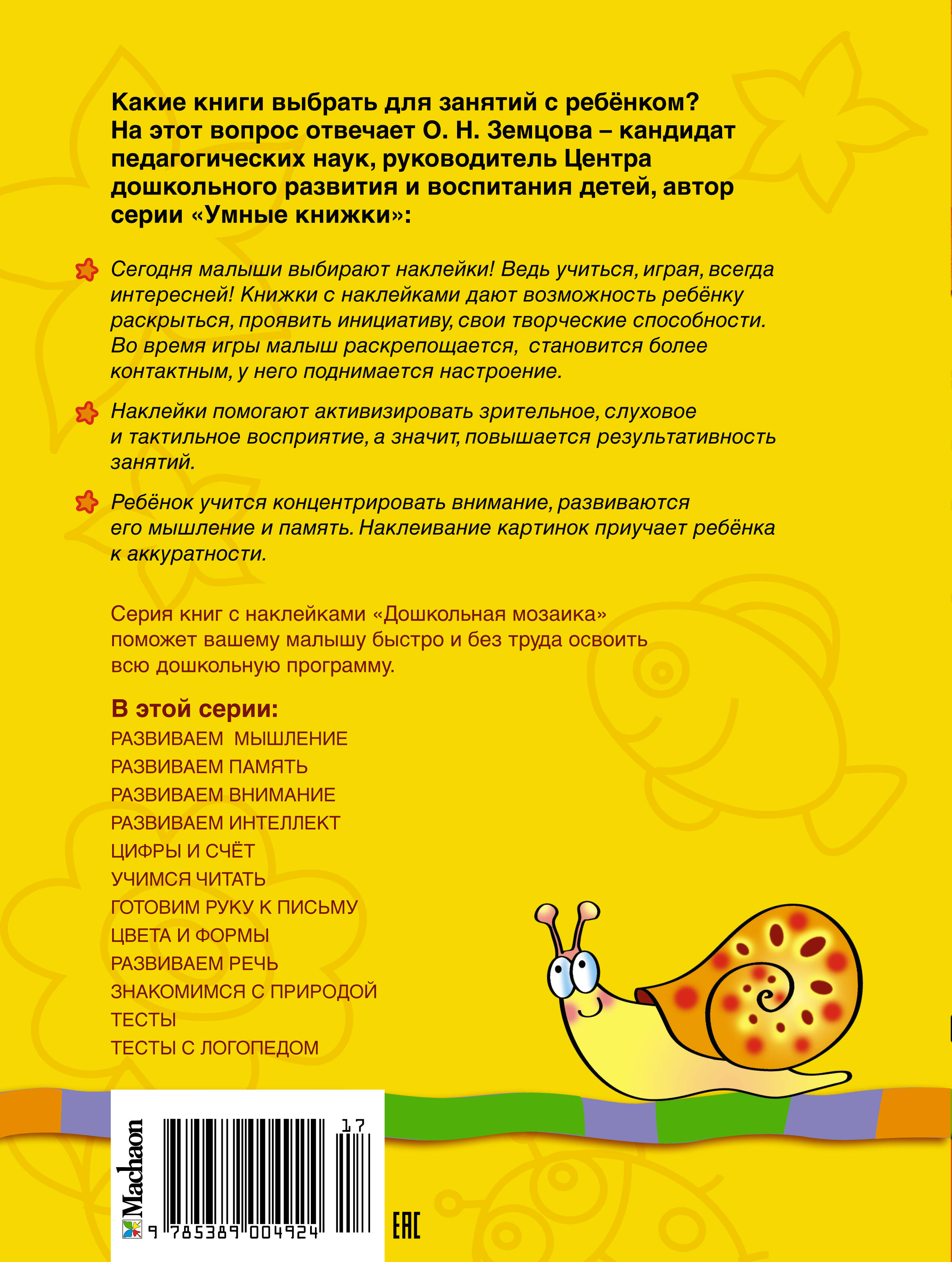 Какие книги выбрать для занятий с ребёнком? На этот вопрос отвечает О.Н. Земцова - кандидат педагогических наук, руководитель Центра дошкольного развития и воспитания детей, автор серии "Умные книжки": Сегодня малыши выбирают наклейки! Ведь учиться, играя, всегда интересней! Книжки с наклейками дают возможность ребёнку раскрыться, проявить инициативу, свои творческие способности. Во время игры малыш раскрепощается, становится более контактным, у него поднимается настроение. Наклейки помогают активизировать зрительное, слуховое и тактильное восприятие, а значит, повышается результативность занятий. Ребёнок учится концентрировать внимание, развиваются его мышление и память. Наклеивание картинок приучает ребёнка к аккуратности. Серия книг с наклейками "Дошкольная мозаика" поможет вашему малышу быстро и без труда освоить всю дошкольную программу.| Издательство | Азбука-Аттикус Издат.группа ООО |