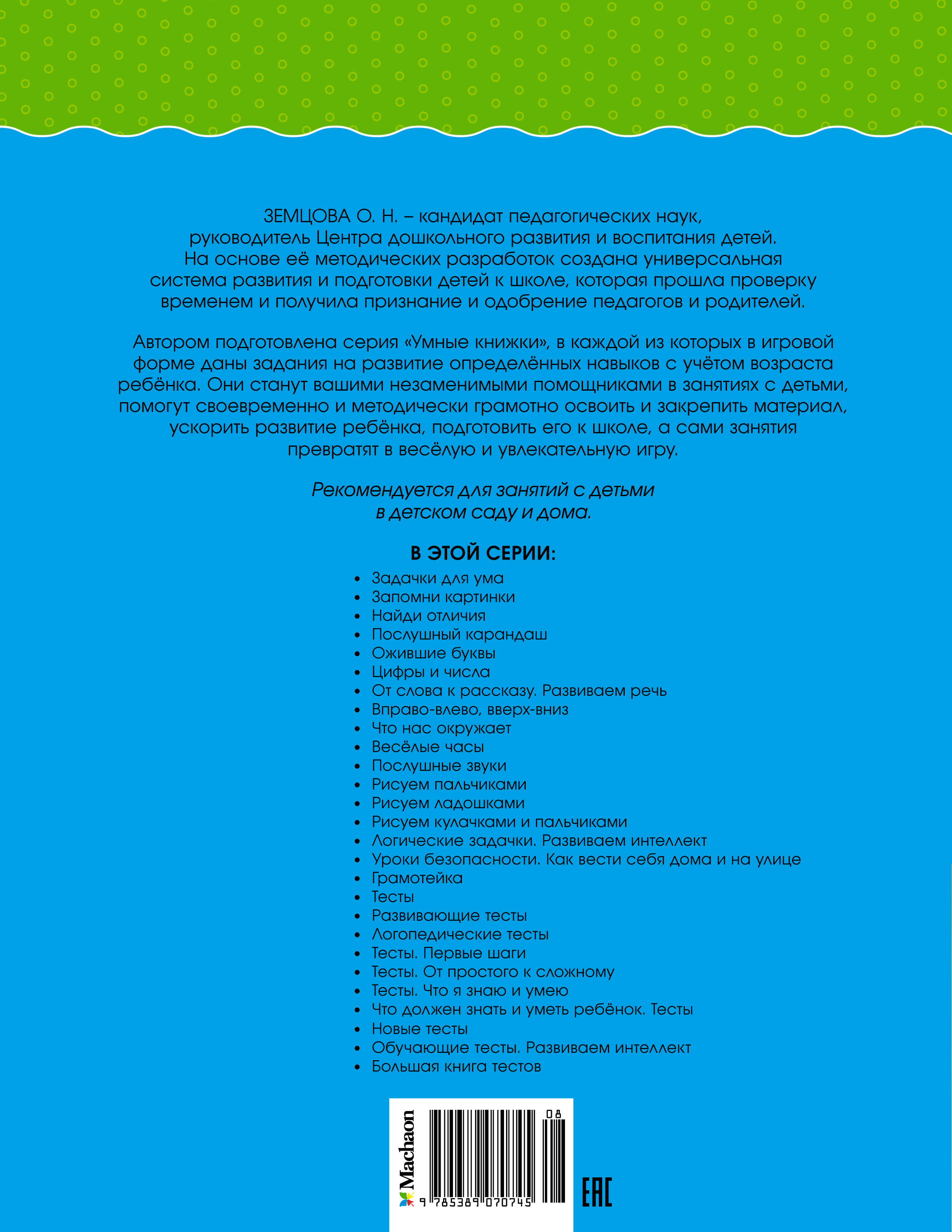 Автором подготовлена серия "Умные книжки", в каждой из которых в игровой форме даны задания на развитие определенных навыков с учетом возраста ребенка. Они станут вашими незаменимыми помощниками в занятиях с детьми, помогут своевременно и методически грамотно освоить и закрепить материал, ускорить развитие ребенка, подготовить его к школе, а сами занятия превратят в веселую и увлекательную игру.| Издательство | Азбука-Аттикус Издат.группа ООО |