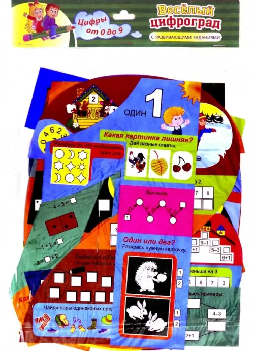 Вниманию родителей и педагогов предлагается комплект новой серии "Весёлый цифроград" с десятью обучающими цифрами. Каждая цифра - это дидактическая игра, представленная крупно в контурном (вырубленном) исполнении на плотном картоне с двусторонней печатью, что делает её привлекательной для занятий и удобной в многократной образовательной деятельности ребёнка.