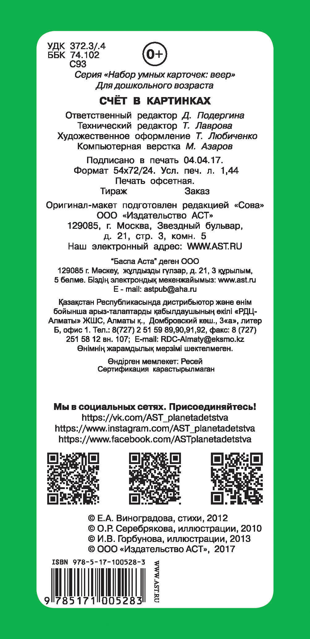 Уникальный комплект обучающих карточек в виде веера поможет малышу быстро и эффективно выучить цифры и числа от 1 до 10, а также научиться складывать и вычитать. Картинки и задачи в стихах сделают процесс обучение весёлым и интересным. Удобный формат веера позволяет брать его с собой и заниматься в любом удобном месте.| Издательство | ИЗДАТЕЛЬСТВО "АСТ" |