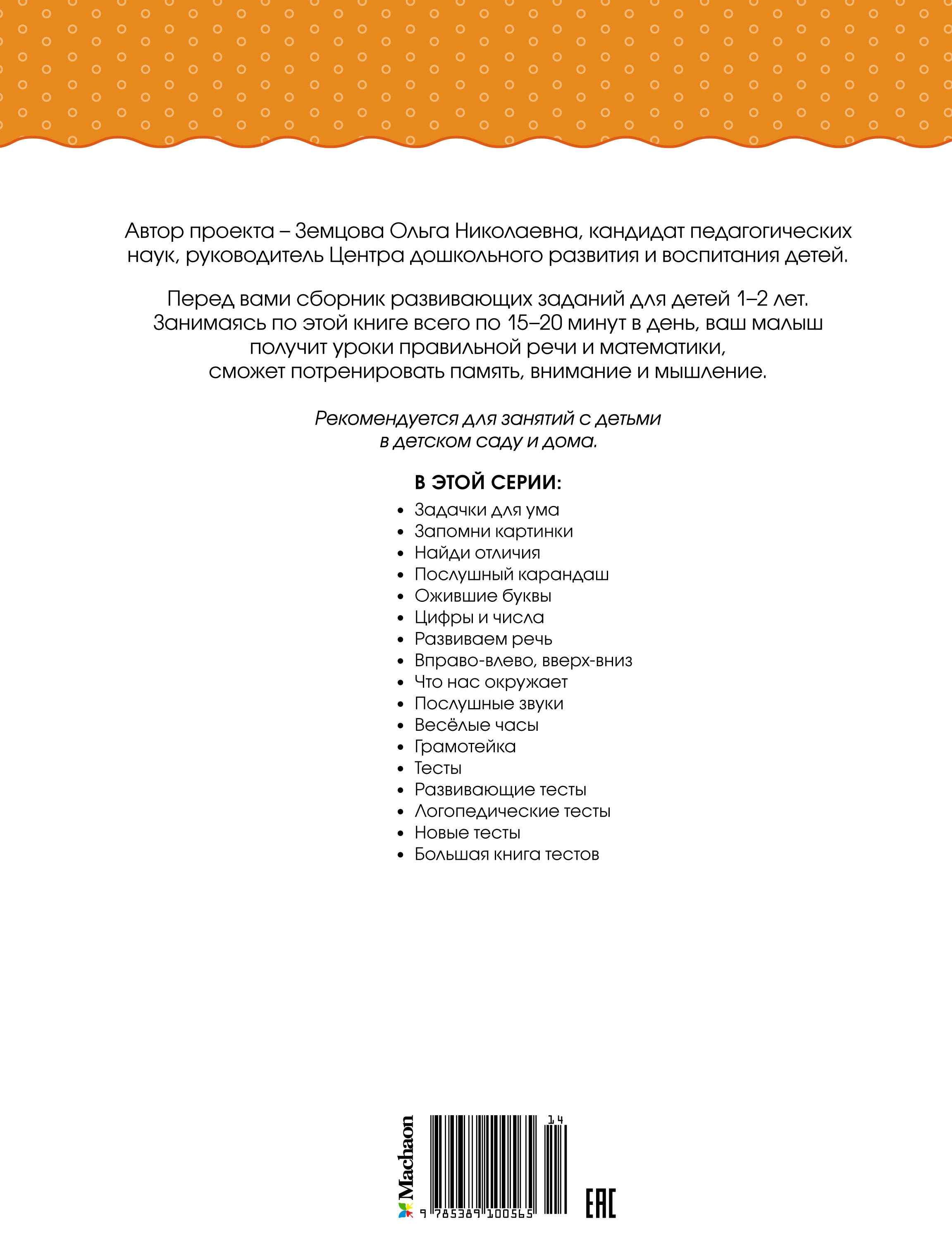 Автор проекта - Земцова Ольга Николаевна, кандидат педагогических наук, руководитель Центра дошкольного развития и воспитания детей. Перед вами сборник развивающих заданий для детей 1-2 лет. Занимаясь по этой книге всего по 15-20 минут в день, ваш малыш получит уроки правильной речи и математики, сможет потренировать память, внимание и мышление. Для детей до 3-х лет.| Издательство | Азбука-Аттикус Издат.группа ООО |