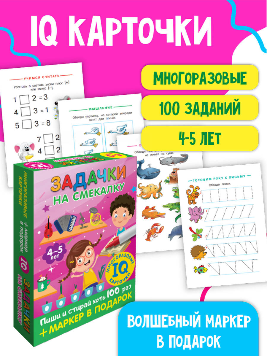 Как научить ребёнка анализировать и делать правильный вывод? Как развить смекалку и сообразительность, необходимые для успешного обучения в школе? Поможет набор многоразовых IQ карточек «Задачки на смекалку. Для детей 4-5 лет»! Ребёнок узнает много нового об окружающем мире, поиграет в занимательные игры, выполнит задания, развивающие мышление, внимание и память, научится сравнивать и анализировать. Все любят сообразительных детей! Бонусом к карточкам прилагается маркер на водной основе - любую надпись легко стереть.| Издательство | ИЗДАТЕЛЬСТВО "АСТ" |