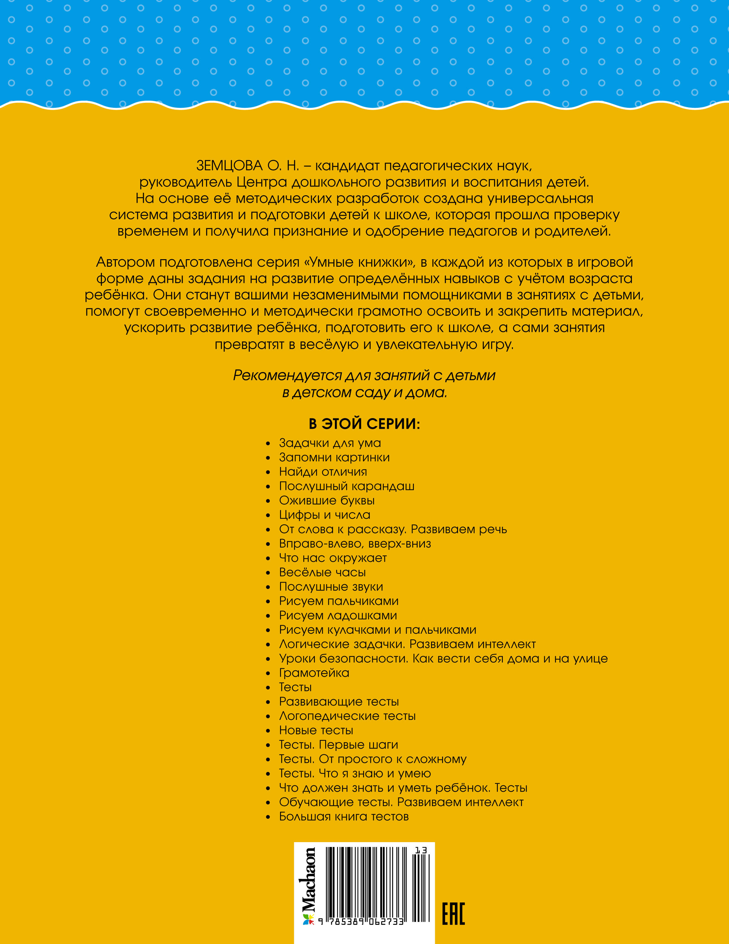 Мы продолжаем серию книг, разработанную Земцова О.Н. - кандидатом педагогических наук, руководителем Центра дошкольного развития и воспитания детей, заслуженным учителем России. На основе ее методических разработок создана универсальная система развития и подготовке детей к школе, которая прошла проверку временем и получила признание и одобрение педагогов и родителей. С книжками легко и удобно работать, надо только объяснить малышам, как они должны выполнять задания. И тогда для маленького ученика занятия превратятся в веселую и увлекательную игру.| Издательство | Азбука-Аттикус Издат.группа ООО |