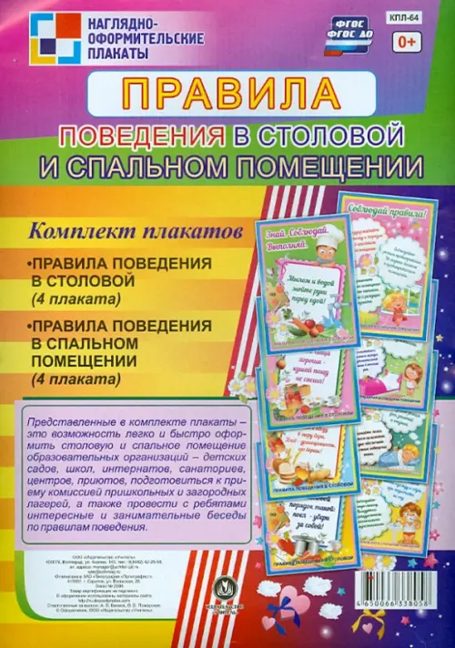 Представленные в комплекте плакаты - это возможность легко и быстро оформить столовую и спальное помещение образовательных организаций - детских садов, школ, интернатов, санаториев, центров, приютов, подготовиться к приему комиссий пришкольных и загородных лагерей, а также провести с ребятами интересные и занимательные беседы по правилам поведения.