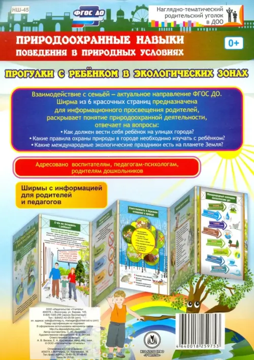 Взаимодействие с семьёй - актуальное направление ФГОС ДО. Данная ширма предназначена для информационного просвещения родителей. Ширма на 6 красочных страницах раскрывает понятие природоохранной деятельности, отвечает родителям на вопросы: