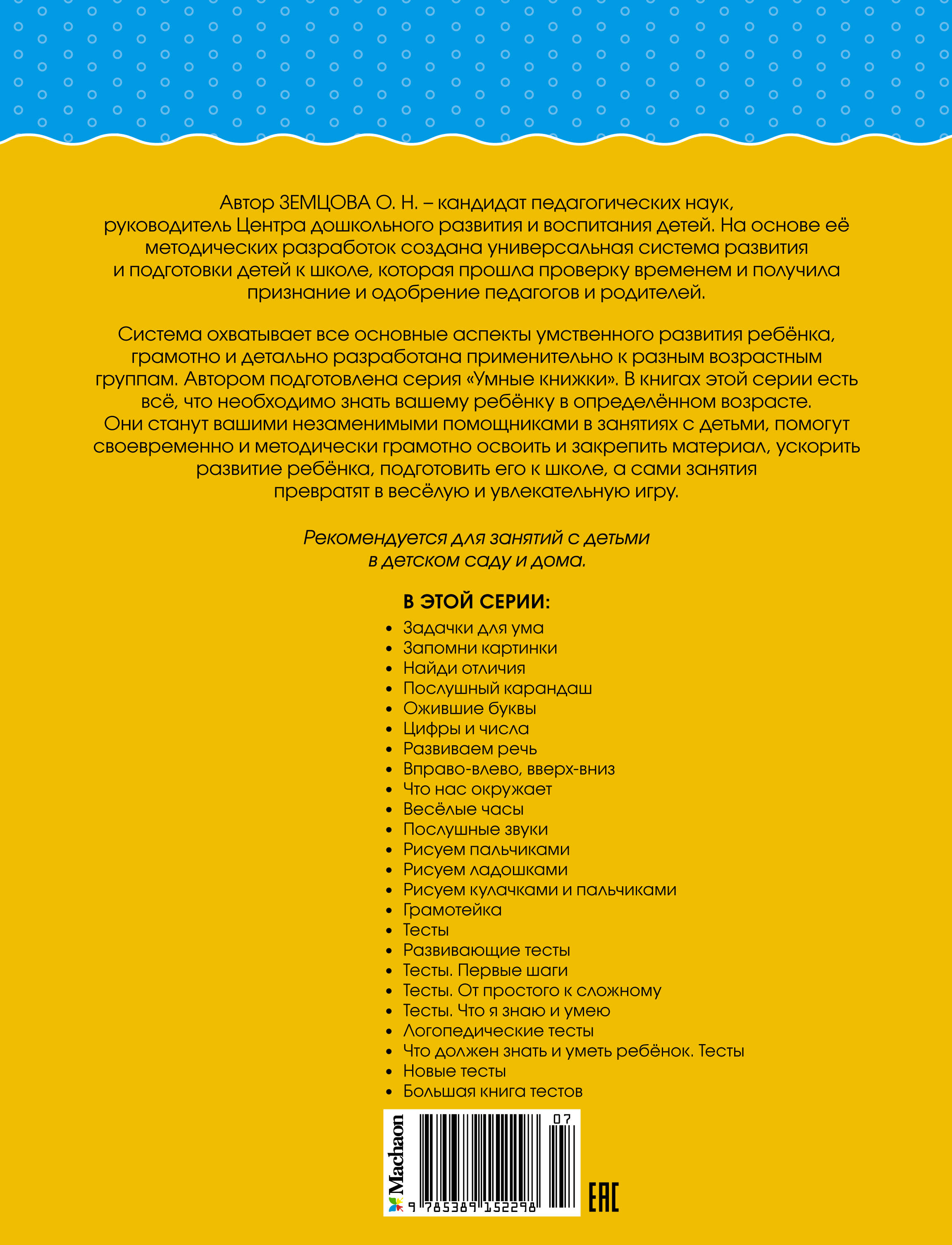 Автор ЗЕМЦОВА О.Н. - кандидат педагогических наук, руководитель Центра дошкольного развития и воспитания детей. На основе её методических разработок создана универсальная система развития и подготовки детей к школе, которая прошла проверку временем и получила признание и одобрение педагогов и родителей. Система охватывает все основные аспекты умственного развития ребёнка, грамотно и детально разработана применительно к разным возрастным группам. Автором подготовлена серия "Умные книжки". В книгах этой серии есть всё, что необходимо знать вашему ребёнку в определённом возрасте. Они станут вашими незаменимыми помощниками в занятиях с детьми, помогут своевременно и методически грамотно освоить и закрепить материал, ускорить развитие ребёнка, подготовить его к школе, а сами занятия превратят в весёлую и увлекательную игру.| Издательство | Азбука-Аттикус Издат.группа ООО |