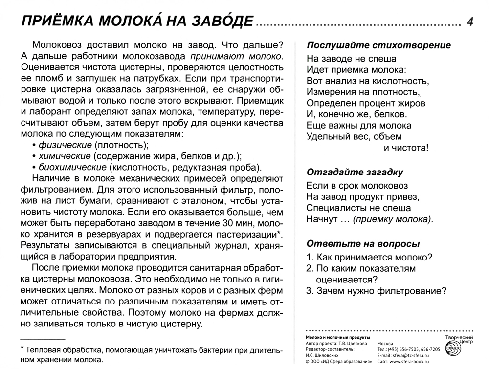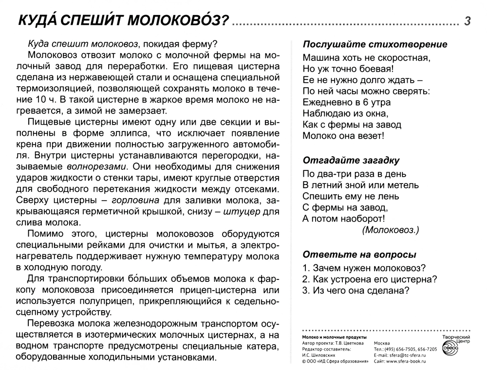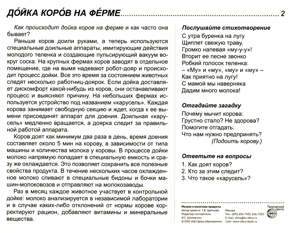 Комплект состоит из 16 цветных демонстрационных картинок, адресован детям и их родителям, желающим познакомиться с современными технологиями изготовления молочной продукции, ее многообразием и значением для жизнедеятельности человека. На лицевой стороне каждой карточки дается цветное изображение молочного продукта, на обратной - подробное описание, из которого дети узнают много интересного и поучительного. Для лучшего закрепления материала представлены оригинальные стихотворения и рифмованные загадки по теме, а также вопросы, на которые ребенок ответит после изучения материала или беседы со взрослым. Комплект подходит для индивидуальной и групповой работы, с детьми 5-9 лет.| Издательство | Творческий центр Сфера |
