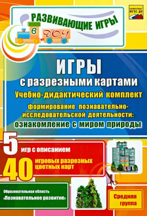 Игры с разрезными картами по формированию познавательно-исследовательской деятельности через ознакомление с миром природы. Средняя группа Учебно-дидактический комплект, составленный с учётом ФГОС на основе практического опыта работы, поможет реализовать базисное содержание образовательной области "Познавательное развитие" с детьми средней группы. В пособии представлены 5 игр с описаниями и методические рекомендации по их организации, варианты реализации и усложнения игрового содержания, а также разнообразный красочный наглядно-дидактический материал к каждой игре, необходимый в организации непосредственно образовательной, совместной и самостоятельной деятельности взрослых и детей. Интеграция содержания различных образовательных областей и видов деятельности позволит расширить и уточнить представления детей о растительном и животном мире, объектах неживой природы, развить познавательную активность и любознательность дошкольников. Предназначено педагогам, родителям, гувернёрам; полезно специалистам дошкольной педагогики, студентам педагогических учебных заведений.