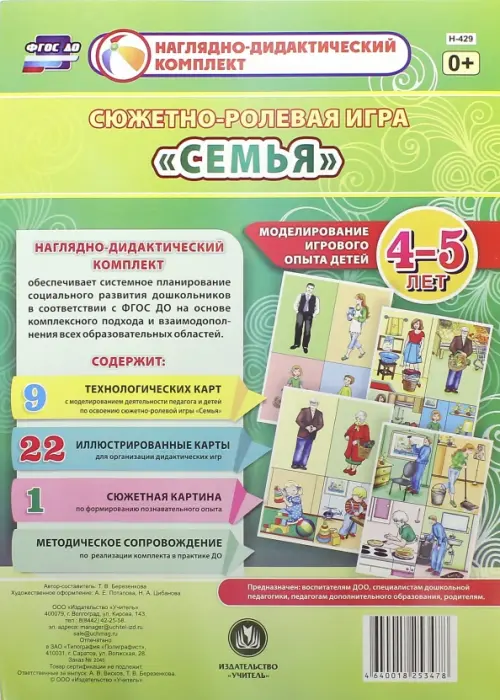 Предлагаемый наглядно-дидактический комплект включает 9 технологических карт, позволяющих комплексно, целостно и последовательно планировать образовательную деятельность по обогащению социального опыта детей 4-5 лет на основе содержания сюжетно-ролевой игры "Семья" в течение учебного года. Представлены также иллюстрированные разрезные карты и красочные сюжетные рисунки (23) для организации бесед, наблюдений, составления рассказов, дидактических игр обучающего и развивающего назначения, соответствующие теме.