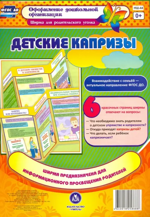 Взаимодействие с семьей - актуальное направление ФГОС ДО. Данная ширма предназначена для информационного просвещения родителей. Ширма на 6 красочных страницах раскрывает понятие "детские капризы", отвечает на вопросы: