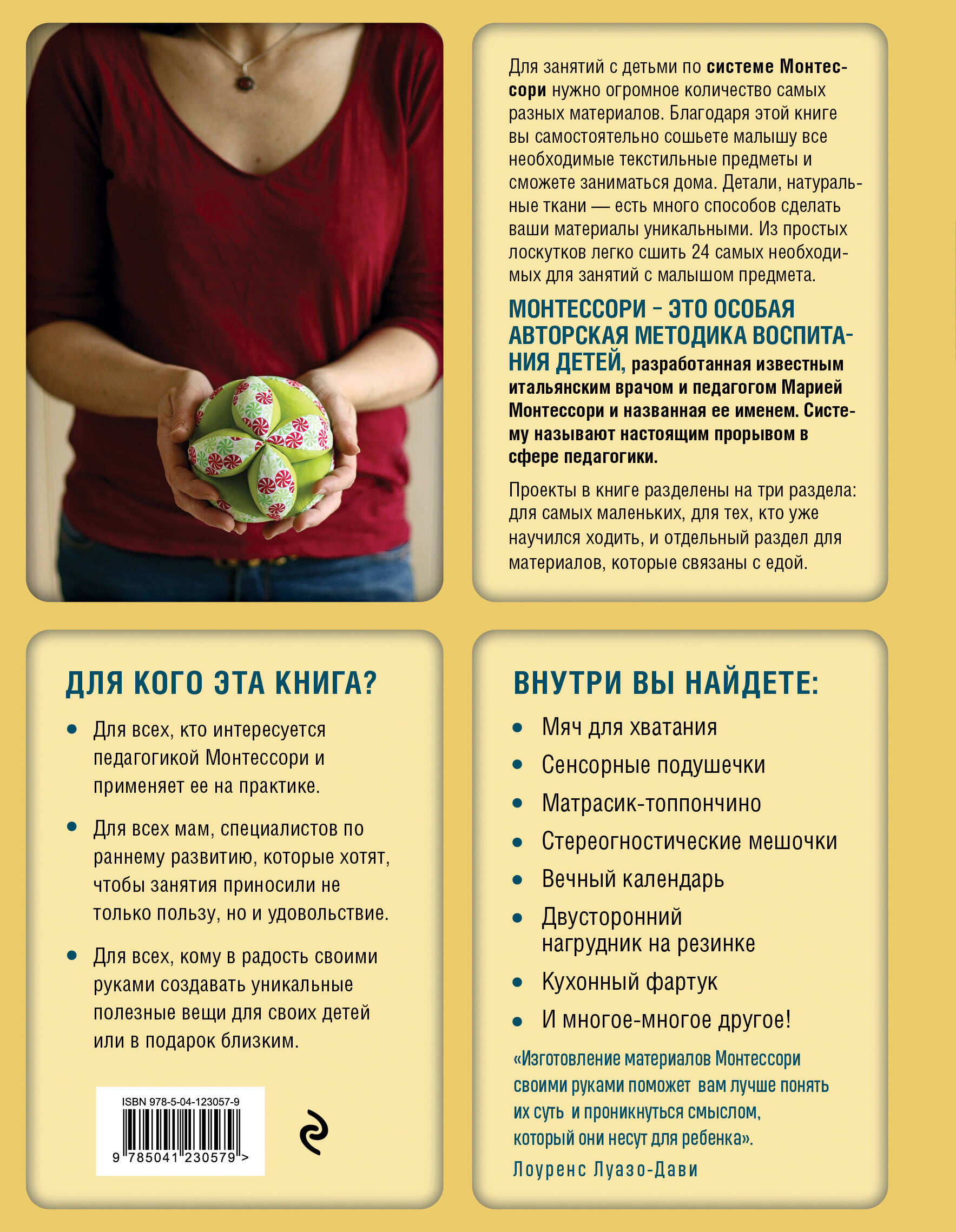 Монтессори - это особая авторская методика занятий с детьми, разработанная известным итальянским врачом и педагогом Марией Монтессори и названная ее именем. Систему называют настоящим прорывом в сфере педагогики. Внутри вы найдете: • Мяч для хватания. • Сенсорные подушечки. • Матрасик-топпончино. • Стереогностические мешочки. • Вечный календарь. • Двусторонний нагрудник на резинке. • Кухонный фартук. И многое-многое другое! Для кого эта книга? - Для всех, кто интересуется педагогикой Монтессори и хочет применять её на практике. - Для всех мам, специалистов по раннему развитию и просто любителей шитья и рукоделия, которые хотят придать уникальный характер своим творениям. - Для всех, кто хочет самостоятельно создавать уникальные полезные вещи для своих детей или в подарок близким и знакомым.| Издательство | ООО "Издательство "Эксмо" |