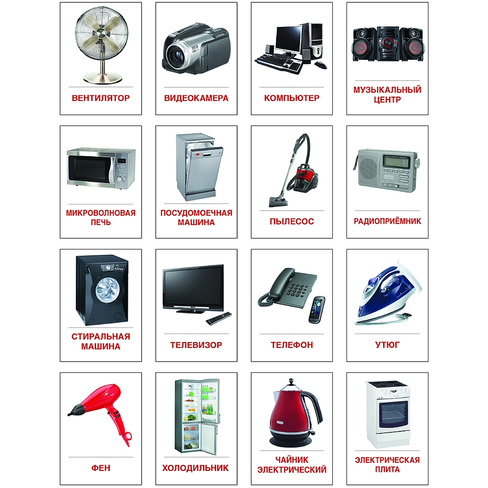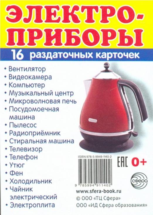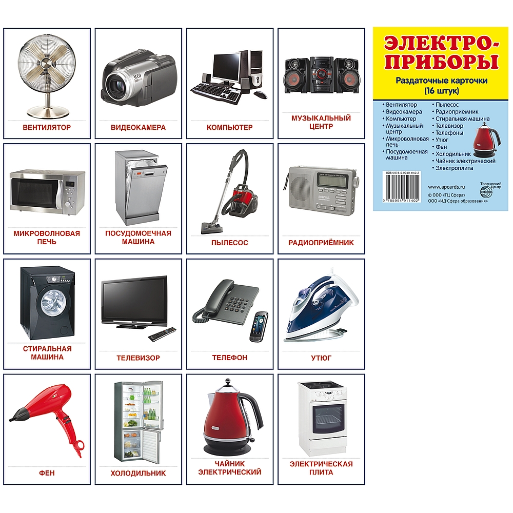 На обороте каждой карточки - название электроприбора на русском языке прописными буквами.