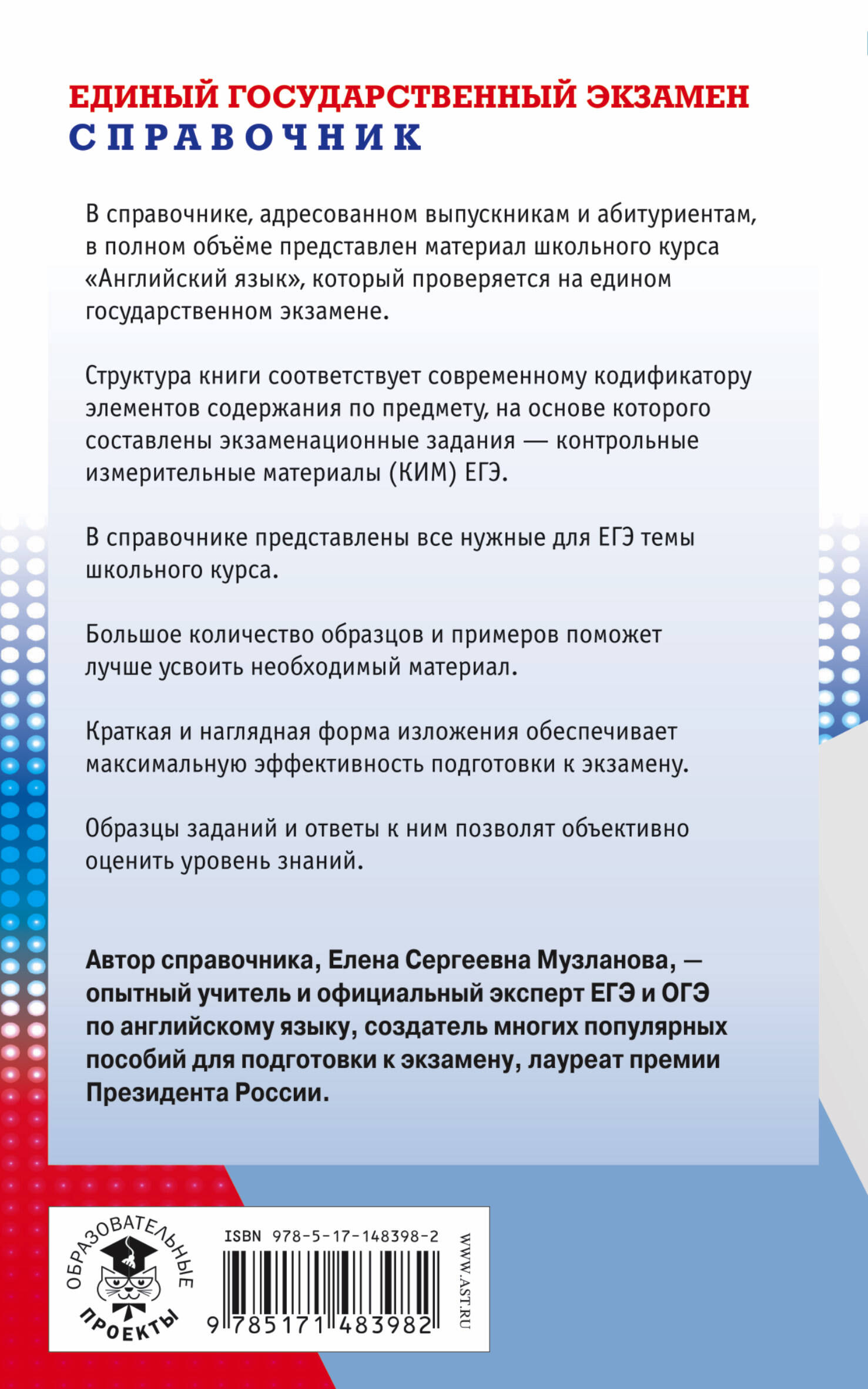 Справочник призван оказать практическую помощь в подготовке учащихся 11 классов и абитуриентов к единому государственному экзамену по английскому языку. Пособие составлено по тематическому принципу и содержит 8 разделов, которые включают справочную информацию по структуре ЕГЭ по английскому языку, материалы ко всем разделам экзамена ("Аудирование", "Чтение", "Грамматика и лексика", "Письмо" и "Говорение"), справочную лексико-грамматическую информацию, а также полный экзаменационный вариант ЕГЭ с комментариями к решению заданий. В каждый раздел ЕГЭ включены рекомендации по его выполнению, необходимый теоретический материал и образцы заданий экзаменационного типа, что позволит учащимся успешно подготовиться к экзамену.| Издательство | АСТ |