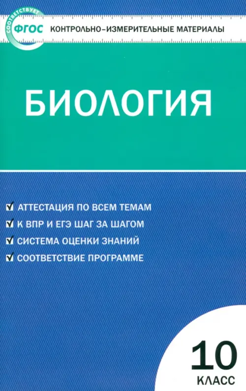 В пособии представлены контрольно-измерительные материалы (КИМы) по биологии для 10 класса. Издание составлено в соответствии с требованиями ФГОС. Структура КИМов аналогична структуре заданий ЕГЭ, что позволит постепенно подготовить учащихся к работе с подобным материалом. В конце издания предложены ключи к тестам.