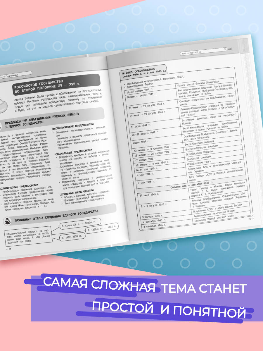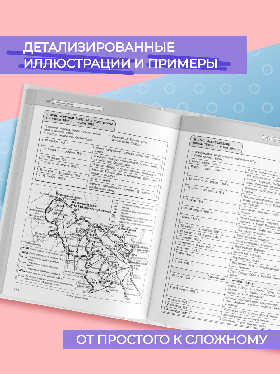 Пособие поможет быстро и эффективно подготовится к урокам, различным формам текущего и промежуточного контроля, а также к экзаменам. В книге в наглядной и доступной форме приводятся основные сведения за весь школьный курс истории. В громоздких учебниках порой бывает сложно найти ответ на какой-то конкретный вопрос. А в данном издании представлена действительно нужная и систематизированная информация, материал изложен последовательно, от простого к сложному, дополняется иллюстрациями, примерами, наглядными схемами и таблицами. В этой книге для школьников можно найти все основные разделы предмета: «Древность и средневековье», «Новое время», «Новейшая история». Справочник обеспечит знание и понимание всех, даже самых сложных тем школьной программы. В нем каждый ученик 6-11 классов найдет много полезного для своего образования, обретет уверенность на уроках, контрольных, ОГЭ и ЕГЭ.| Издательство | ООО "Издательство "Эксмо" |
