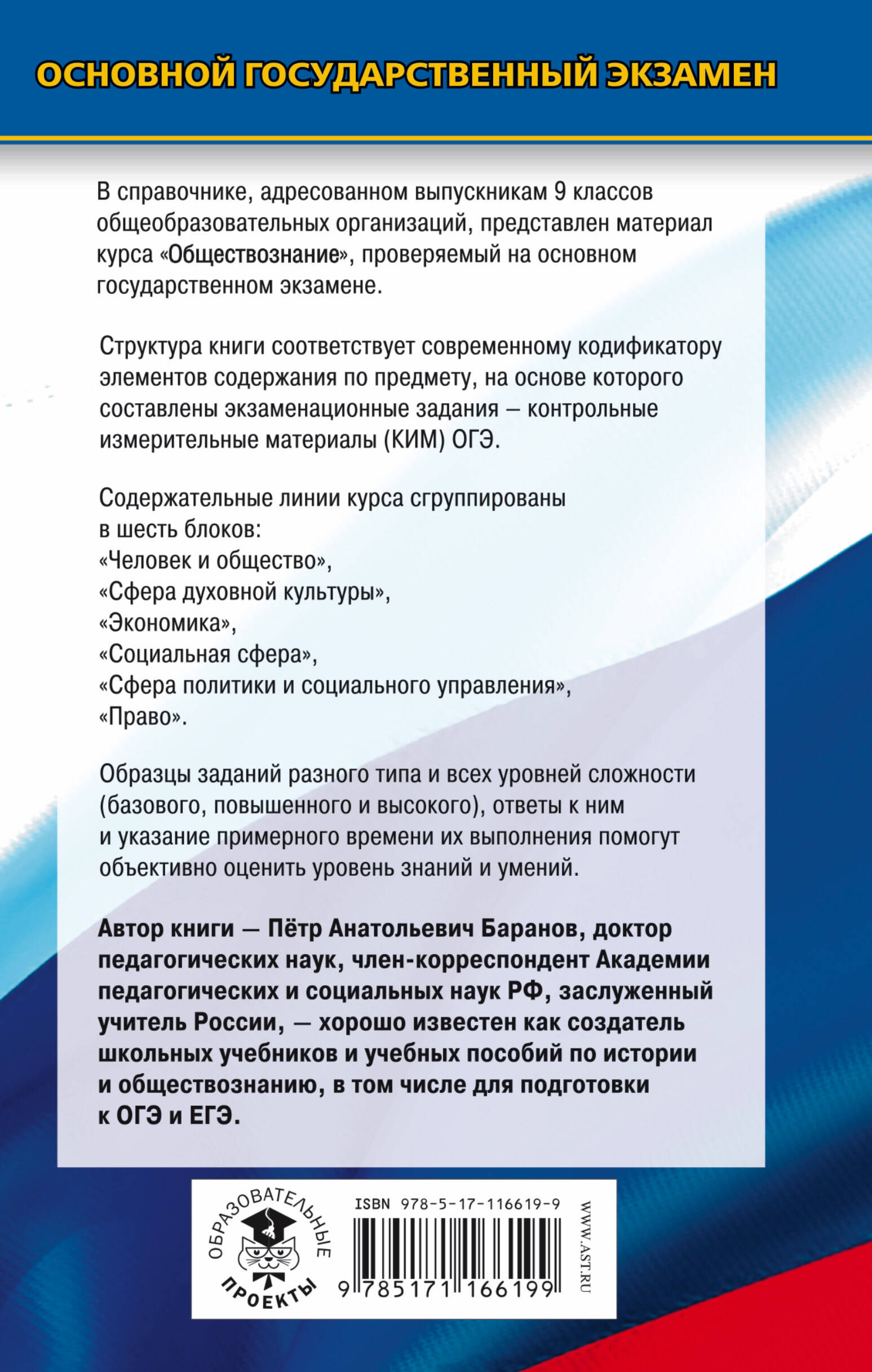 В справочнике, адресованном выпускникам 9 классов общеобразовательных учреждений, представлен материал курса «Обществознание» в объёме, проверяемом наосновном государственном экзамене. Структура книги соответствует современному кодификатору элементов содержания по предмету, на основе которого составлены контрольные измерительные материалы ОГЭ. Содержательные линии курса сгруппированы в шесть блоков-модулей: «Человек и общество», «Сфера духовной культуры», «Экономика», «Социальная сфера», «Сфера политики и социального управления», «Право». Полнота, компактность, наглядность и чёткость изложения обеспечивают максимальную эффективность подготовки к экзамену. Образцы заданий разного типа (А,В,С) и всех уровней сложности (базового, повышенного и высокого), ответы к ним и указание примерного времени их выполнения помогут объективно оценить уровень знаний и умений.| Издательство | Издательство "АСТ" |