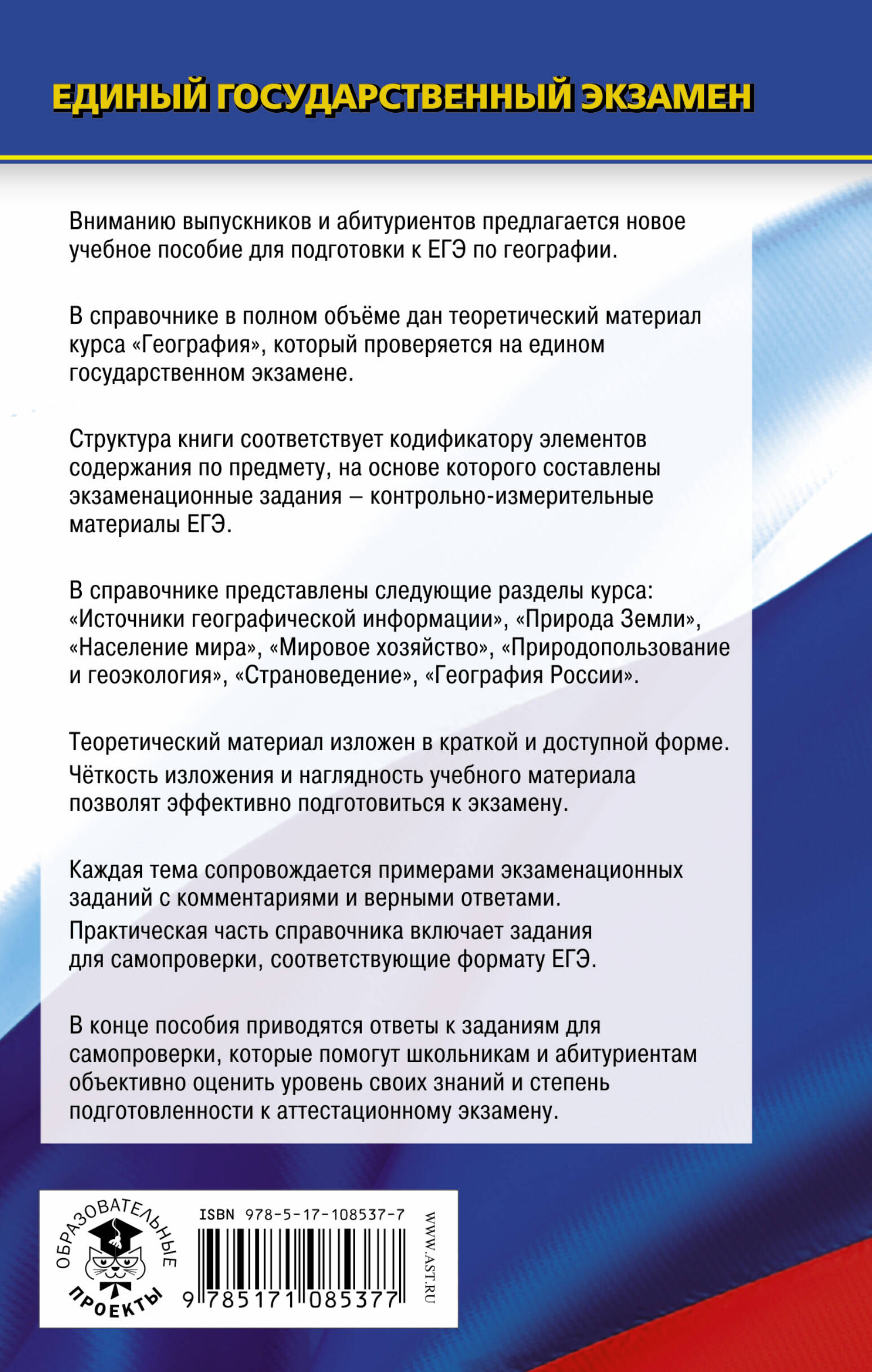 Вниманию выпускников и абитуриентов предлагается новое учебное пособие для подготовки к ЕГЭ по географии. Справочник содержит в полном объеме теоретический материал по курсу географии, необходимый для сдачи ЕГЭ. Структура книги соответствует современному кодификатору элементов содержания по предмету, на основе которого составлены экзаменационные задания - контрольно-измерительные материалы (КИМ) ЕГЭ. Теоретический материал изложен в краткой, доступной форме. Каждая тема сопровождается примерами экзаменационных заданий с комментариями и ответами. Это поможет учителю организовать подготовку к единому государственному экзамену, а учащимся - самостоятельно проверить свои знания и готовность к сдаче выпускного экзамена. Практическая часть справочника включает задания для самопроверки, соответствующие формату ЕГЭ. В конце пособия приводятся ответы к заданиям для самопроверки, которые помогут школьникам и абитуриентам объективно оценить уровень своих знаний и степень подготовленности к аттестационному экзамену. Пособие адресовано старшим школьникам, абитуриентам и учителям.| Издательство | Издательство "АСТ" |
