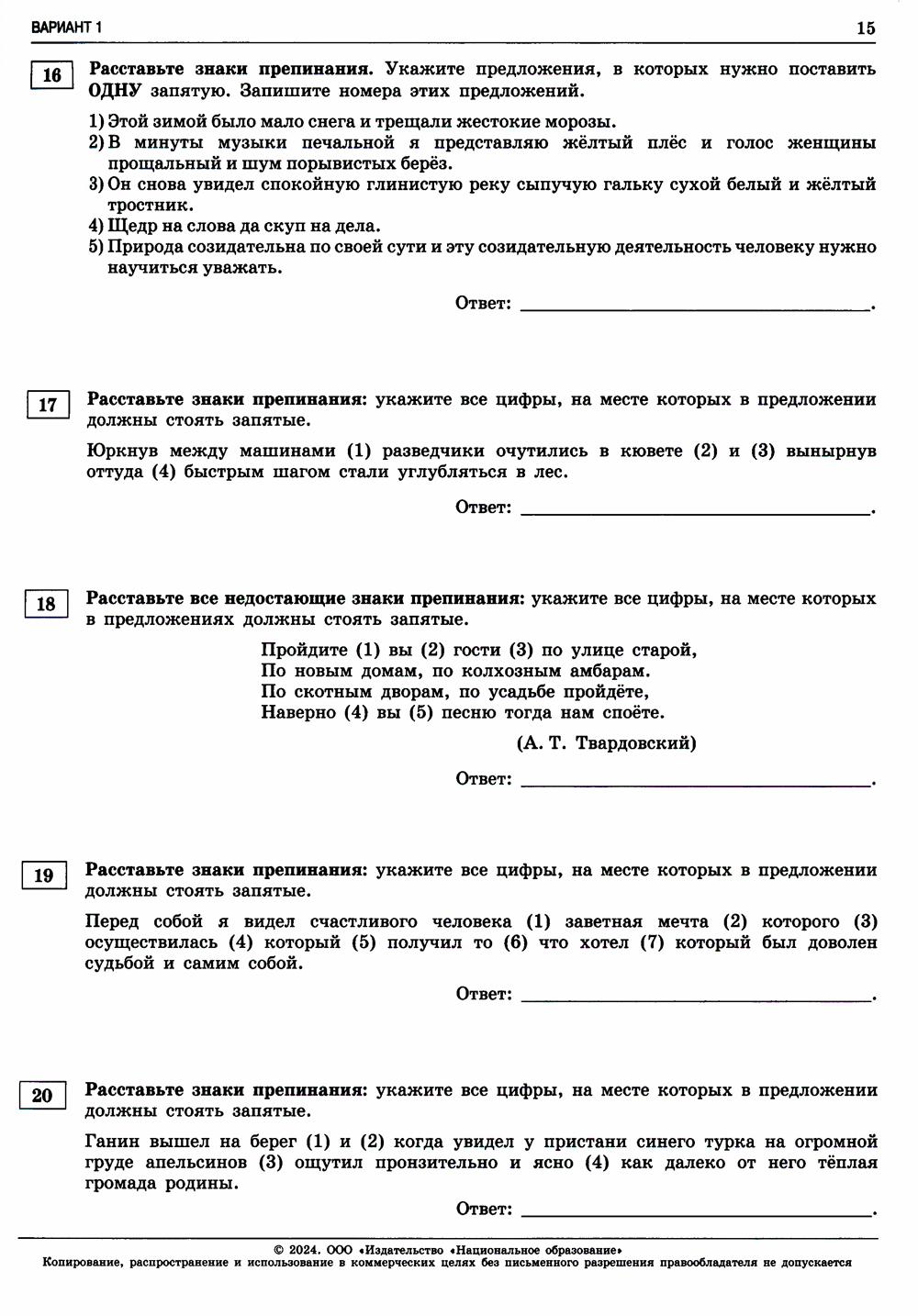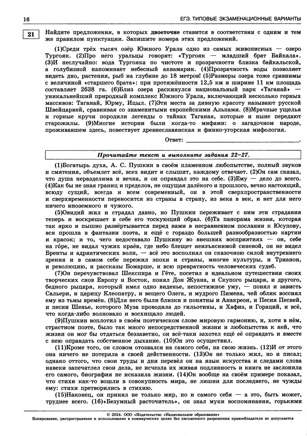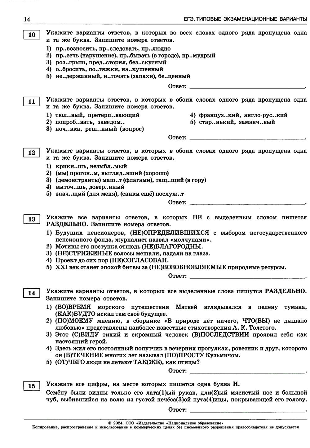 Серия подготовлена разработчиками контрольных измерительных материалов (КИМ) единого государственного экзамена. В сборнике представлены материалы: • 36 типовых экзаменационных вариантов, составленных в соответствии с проектом демоверсии КИМ ЕГЭ по русскому языку 2024 года; • инструкция по выполнению экзаменационной работы; • ответы ко всем заданиям; • критерии оценивания. Выполнение заданий типовых экзаменационных вариантов предоставляет обучающимся возможность самостоятельно подготовиться к государственной итоговой аттестации в форме ЕГЭ, а также объективно оценить уровень своей подготовки к экзамену. Учителя могут использовать типовые экзаменационные варианты для организации контроля результатов освоения школьниками образовательных программ среднего общего образования и интенсивной подготовки обучающихся к ЕГЭ.
