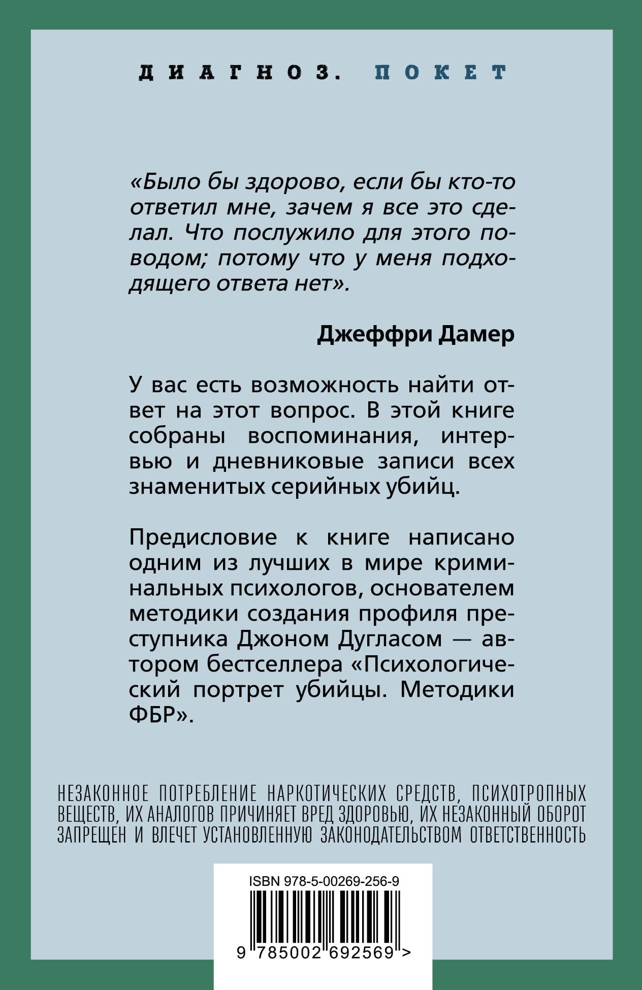 НЕЗАКОННОЕ ПОТРЕБЛЕНИЕ НАРКОТИЧЕСКИХ СРЕДСТВ, ПСИХОТРОПНЫХ ВЕЩЕСТВ, ИХ АНАЛОГОВ ПРИЧИНЯЕТ ВРЕД ЗДОРОВЬЮ, ИХ НЕЗАКОННЫЙ ОБОРОТ ЗАПРЕЩЕН И ВЛЕЧЕТ УСТАНОВЛЕННУЮ ЗАКОНОДАТЕЛЬСТВОМ ОТВЕТСТВЕННОСТЬ. "Было бы здорово, если бы кто-то ответил мне, зачем я все это сделал. Что послужило для этого поводом; потому что у меня подходящего ответа нет". Джеффри Дамер У вас есть возможность найти ответ на этот вопрос. В этой книге собраны воспоминания, интервью и дневниковые записи всех знаменитых серийных убийц. Предисловие к книге написано одним из лучших криминальных психологов в мире, основателем методики создания профиля преступника Джоном Дугласом - автором бестселлера "Психологический портрет убийцы. Методики ФБР".| Издательство | Родина Издательство ООО |