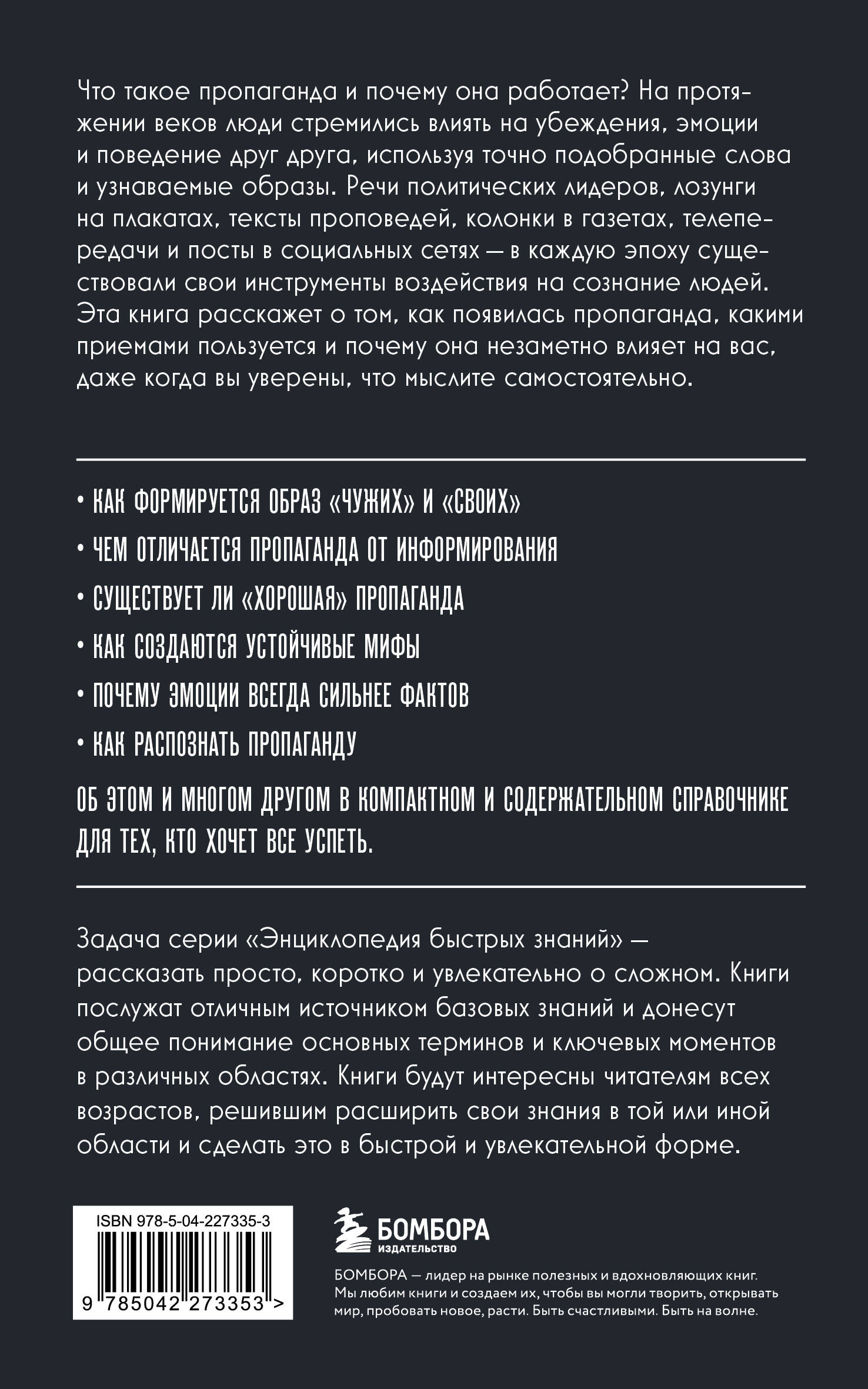 Пропаганда на протяжении веков существовала в качестве важнейшего инструмента воздействия на общественное сознание, меняя свои формы и каналы распространения, при этом сохраняя базовые принципы влияния на убеждения и эмоции людей. Она сопровождала религиозные учения, политические движения и культурные процессы, помогая формировать устойчивые представления о мире, упрощать сложные события и создавать понятные образы врагов и союзников. Эта книга рассказывает о том, как возникла пропаганда, какими приемами она пользуется и почему ее воздействие часто остается незаметным даже для хорошо информированного человека. Краткое и доступное изложение позволяет получить целостное представление о механизмах пропаганды и ее современных проявлениях. Задача серии «Энциклопедия быстрых знаний» - рассказать просто, коротко и увлекательно о сложном. Книги послужат отличным источником базовых знаний и донесут общее понимание основных терминов и ключевых моментов в различных областях. Книги будут интересны читателям всех возрастов, решившим расширить свои знания в той или иной области и сделать это в быстрой и увлекательной форме.| Издательство | ООО "Издательство "Эксмо" |