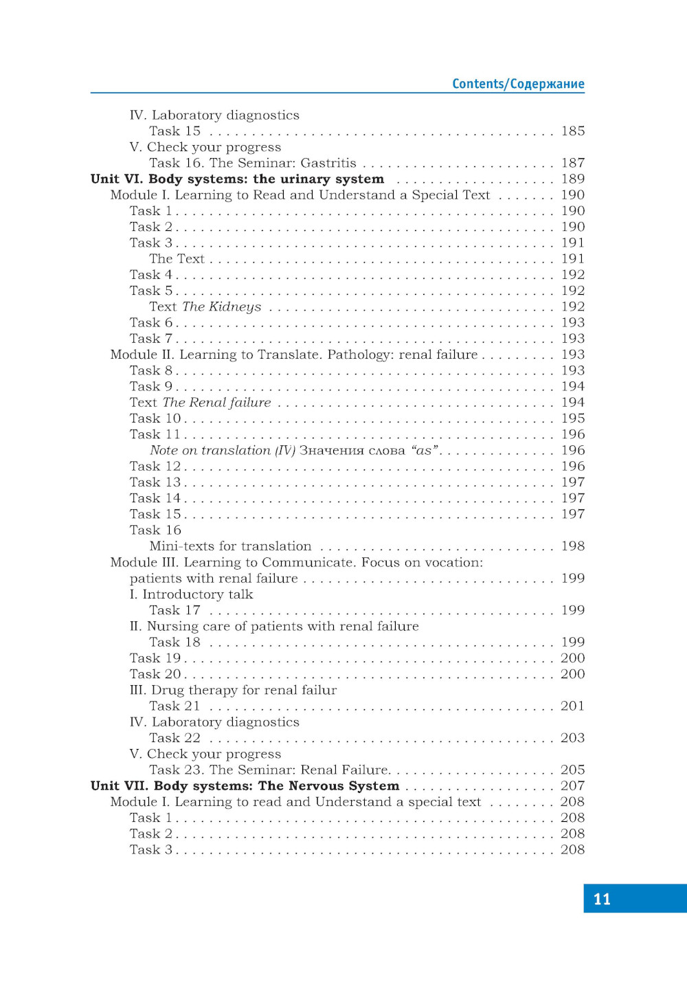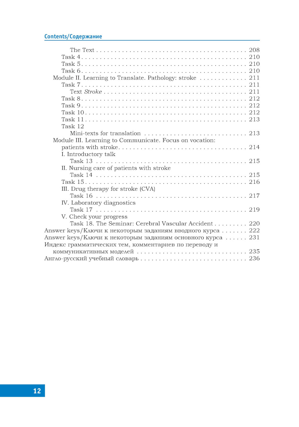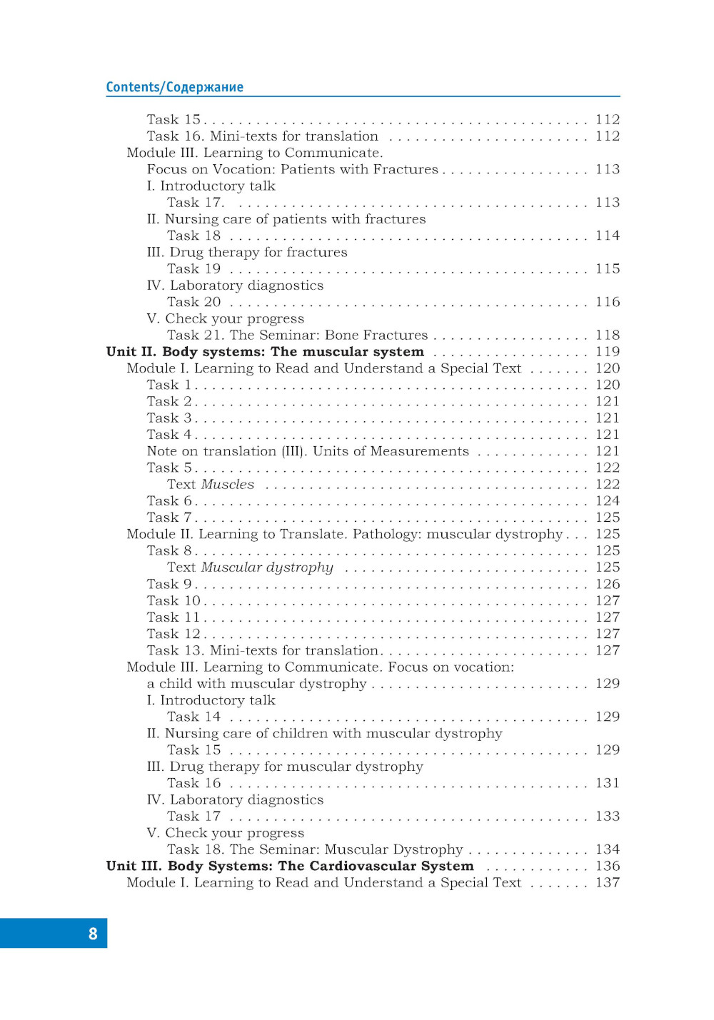 курс - имеет целью формирование и развитие умений и навыков работы с более сложными источниками информации - научными и специальными медицинскими текстами. Предложенная авторами система заданий формирует у обучающихся алгоритм анализа и чтения англоязычных текстов, обеспечивающий их понимание, извлечение необходимой информации и ее фиксацию различными способами (выполнение письменного перевода, составление аннотации, заполнение таблиц, содержащих определенные факты, и др.). Развитие умений устного общения также ориентировано на коммуникацию в условиях профессиональной деятельности. Авторская методическая концепция обучения иностранным языкам «для специальных целей» обеспечивает обучающихся знаниями, умениями и навыками, необходимыми для дальнейшего самостоятельного изучения и использования иностранного языка в условиях профессиональной деятельности.