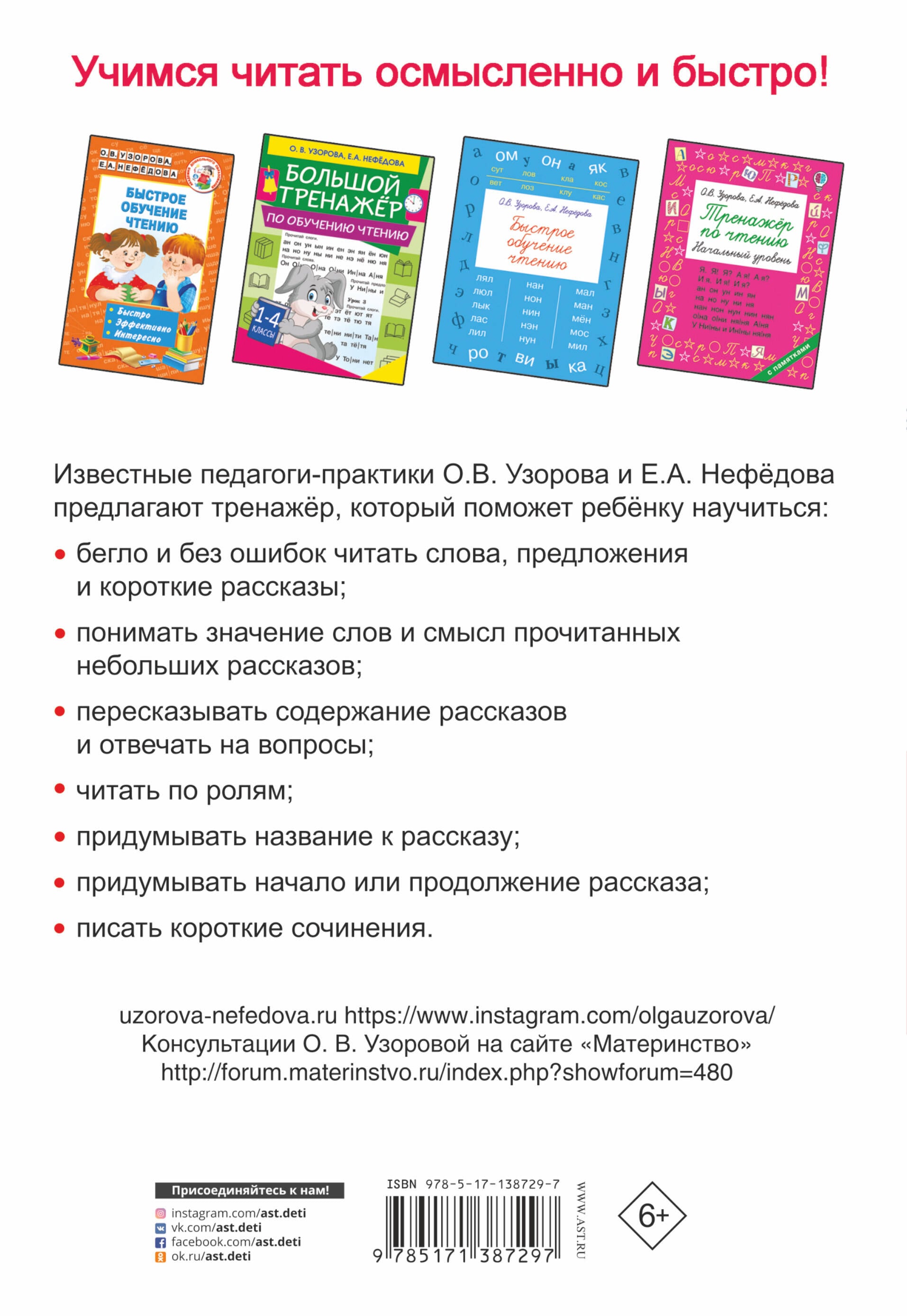 О чем эта книга Пособие известных педагогов-практиков О. В. Узоровой и Е. А. Нефёдовой поможет ребёнку научиться читать слова, предложения и короткие рассказы. Кому эта книга будет интересна Первоклассникам, а также учащимся 2-4 классов. Каковы особенности этой книги • Отличное пособие для обучения чтению. • В книге даны упражнения и задания, которые помогут ребёнку научиться читать, а также понимать значение слов, смысл прочитанных небольших рассказов, отвечать на вопросы, пересказывать их содержание. • Книга будет полезна первоклассникам, а также учащимся 2-4 классов.| Издательство | Издательство "АСТ" |